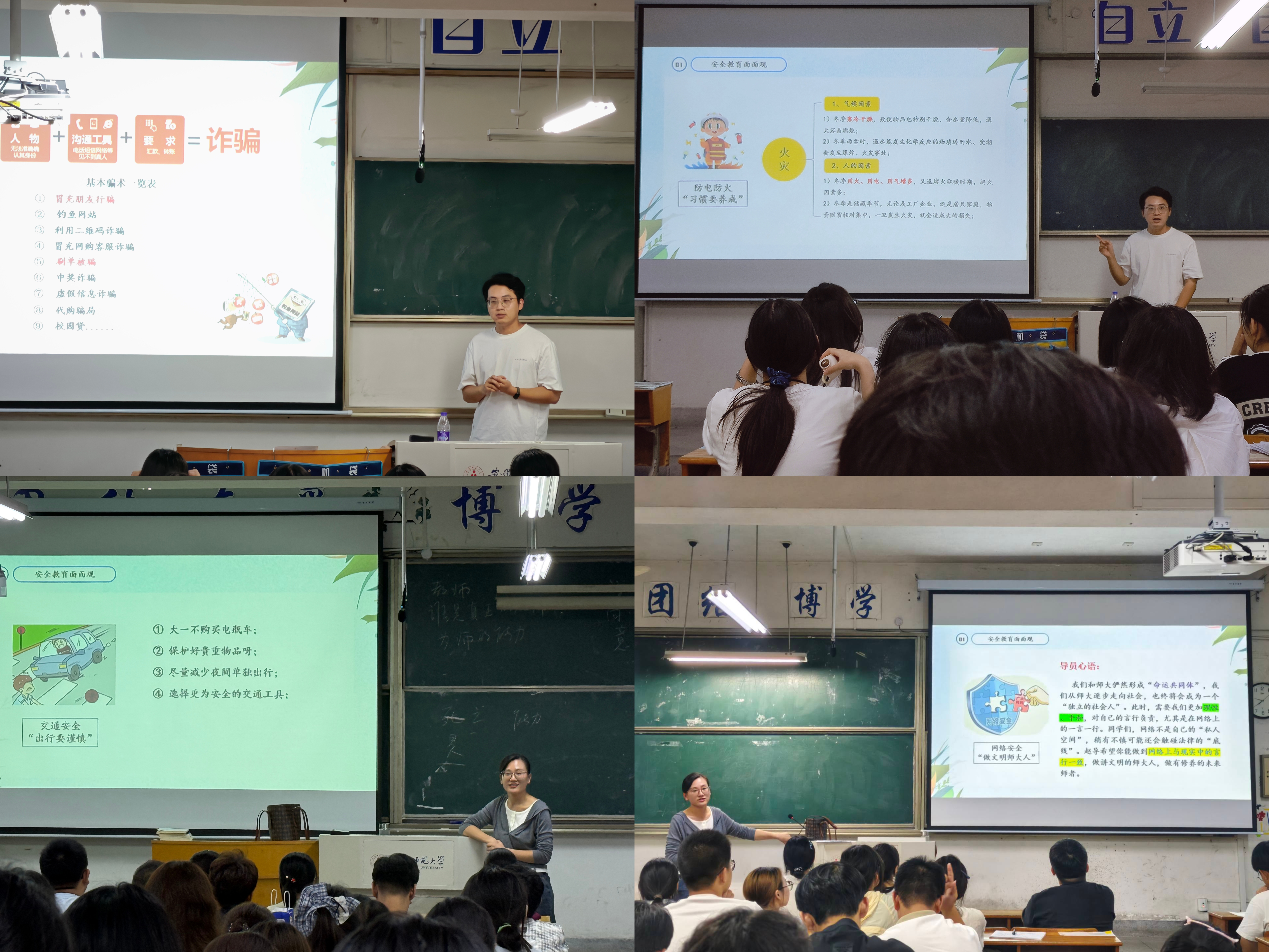 师生共讲,安全知识面面俱到。辅导员张理强、赵茜则围绕交通安全、防火防盗、网络安全等主题,结合生动实例开展了系列安全教育主题班会,深入浅出地阐述了增强安全意识的重要性,更深刻传递了“安全无小事”的核心理念,切实增强了学生的防范意识与应对能力。