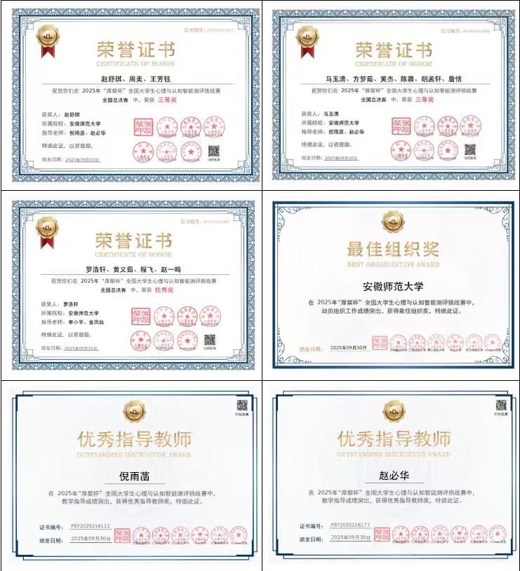 2025年9月27日,首届“厚粲杯”全国大学生心理与认知智能测评挑战赛全国总决赛闭幕式暨成果报告会圆满落幕。经校赛、赛区赛、全国总决赛层层选拔,我校教育科学学院心理学系3支参赛队伍喜创佳绩,其中获得东部赛区一等奖2项、二等奖1项,荣获全国总决赛三等奖2项、优秀奖1项,同时,安徽师范大学获得最佳组织奖,倪雨菡、赵必华获得优秀指导教师奖。