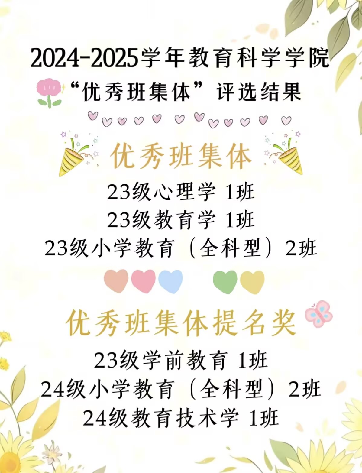 经各位评委老师商议,23级心理学1班,23级教育学1班,23级小学教育(全科型)2班荣获院级优秀班集体称号,23级学前教育1班,24级小学教育(全科型)2班,24级教育技术学1班获院级优秀班集体提名奖。
