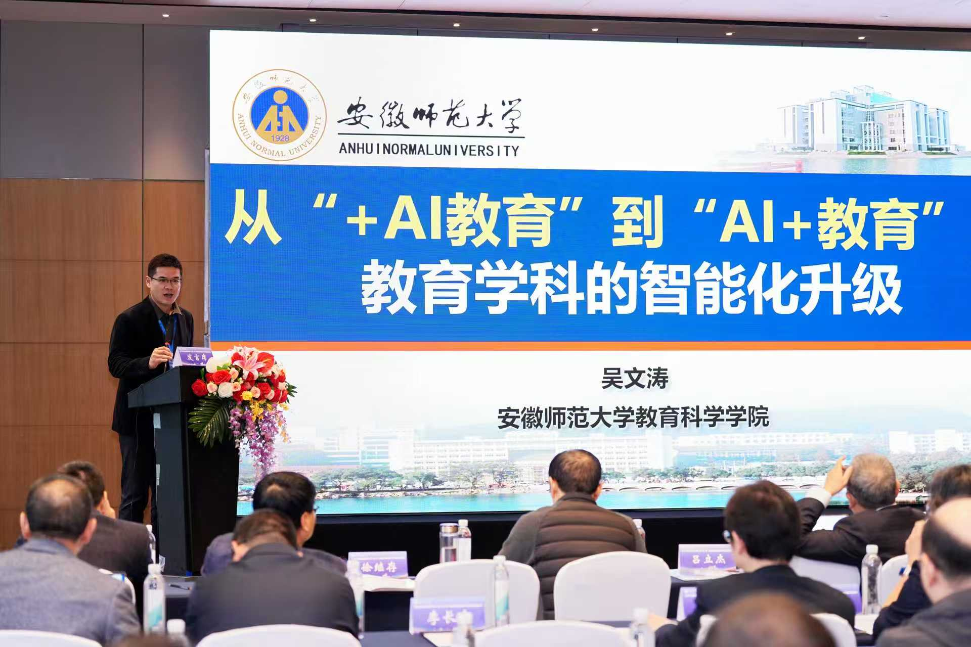 在大会主旨发言环节,来自北京大学、北京师范大学、东北师范大学、西南大学、陕西师范大学、南京师范大学、山西大学、山东师范大学、上海师范大学、上海交通大学、安徽师范大学等12所高校的教育学院(部)院(部)长先后发言。我院院长吴文涛以《从“+AI教育”到“AI+教育”——教育学科的智能化升级》作主旨发言,分享我院在学科升级改造、学科人才培养、学科课程建设等方面的新举措和新成效。