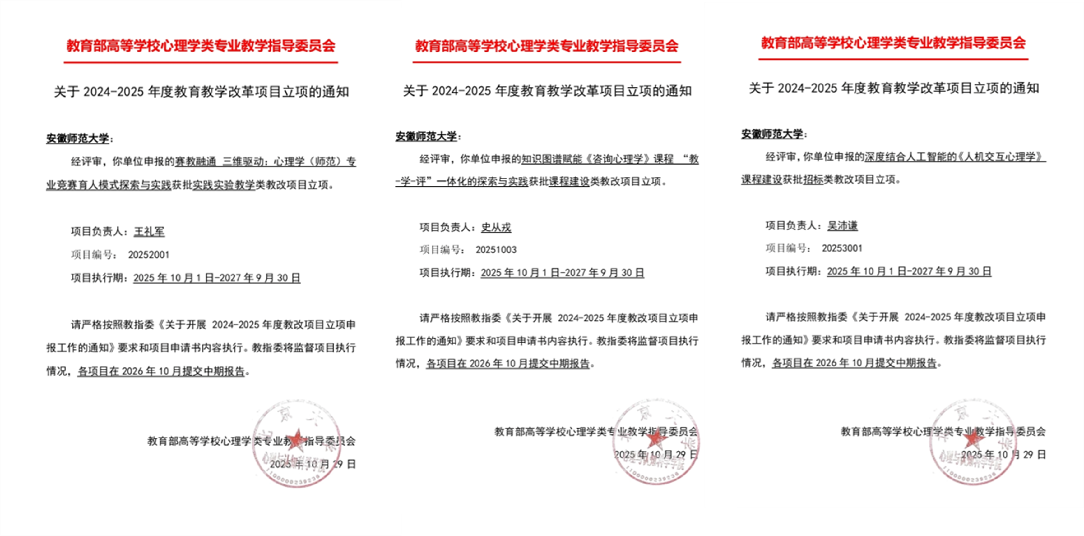 本年度心理学教指委共收到223项申请,经严格评审,最终立项课程建设类69项、实践教学类58项、招标类34项。我院三位教师同时获批立项,体现了学院在心理学教育教学改革方面的扎实积累与前瞻布局,也体现了心理学专业在教育教学改革方面的积极进展与创新能力。三位老师将严格按照项目内容和工作计划扎实推进项目工作。同时,学院将持续支持专业教师开展教学改革与创新实践,不断提升人才培养质量,助力心理学教育教学事业高质量发展。