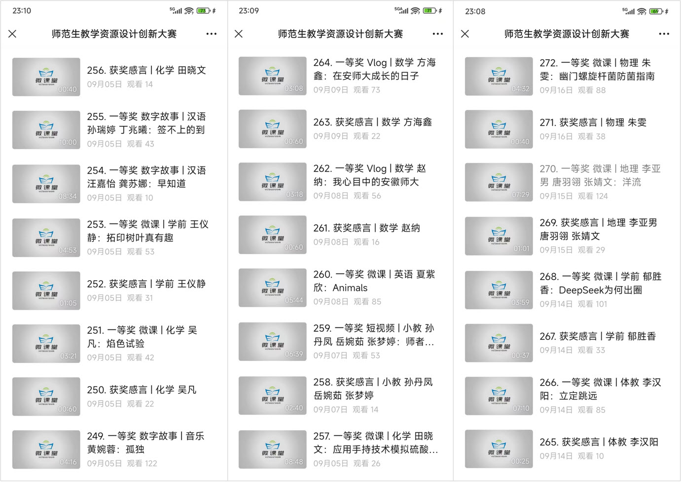 本届大赛贯穿2024-2025整个学年,以教师教育核心课程“现代教育技术应用”为依托,构建了“课程+赛事”的实践育人体系,吸引全校12个学院、14个专业、67个班级的师生踊跃参与,参与人数超3000人,共收到微课、Vlog、数字故事等多模态作品296 件。大赛紧扣“我眼中的教育数字化”“我的教师梦”“中华优秀传统文化与学科融合”等主题,聚焦师范生数字教育资源设计、开发与应用能力的考查,历经资格初审、学院初赛、校级复评、专家终审等多轮角逐,最终评选出一等奖 15 项、二等奖 20 项、三等奖 30 项及若干优秀奖。目前,部分获奖佳作已通过 “教育技术微课堂” 智慧教学平台上线展示,形成优质资源共享辐射效应。
