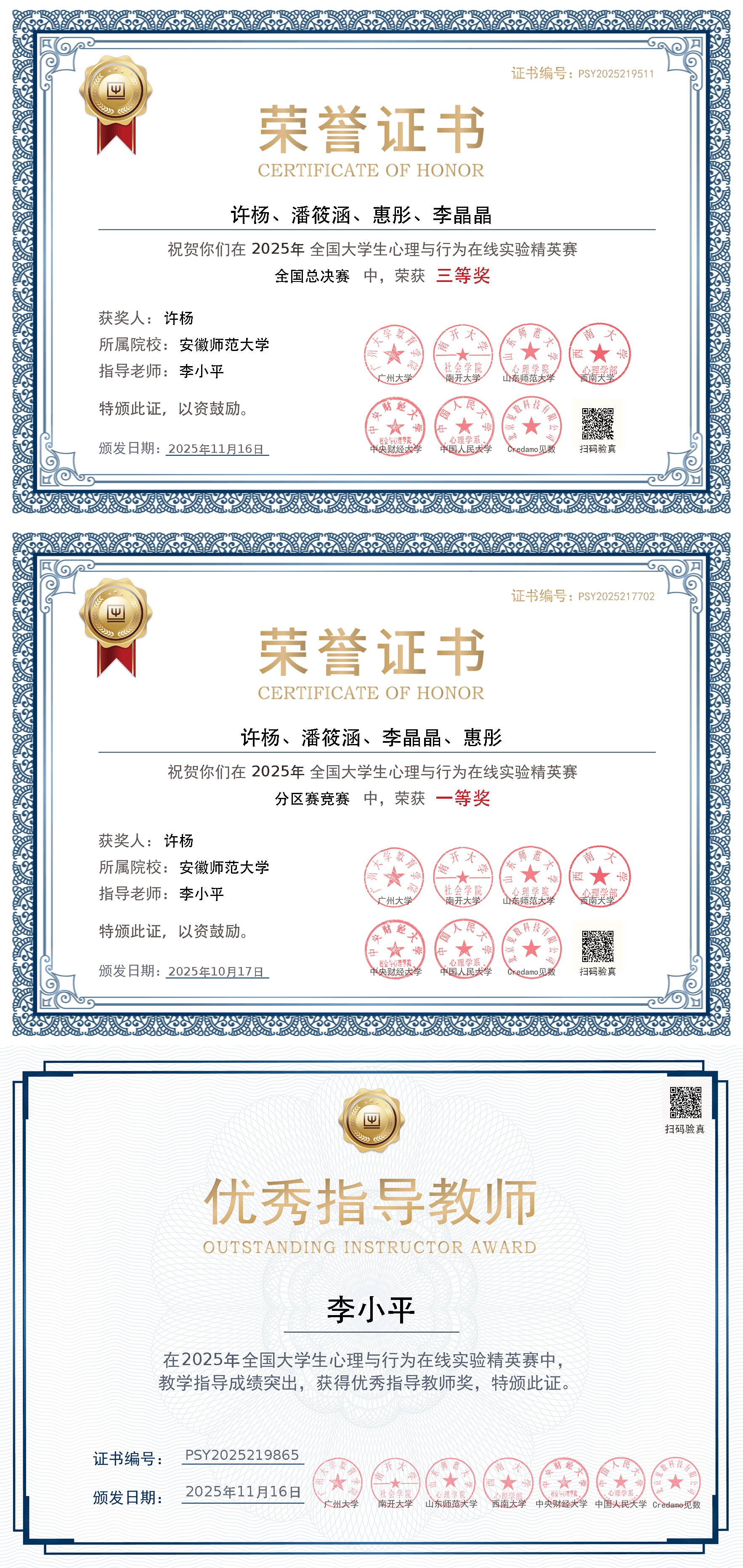 2025年11月15日,第三届全国大学生心理与行为在线实验精英赛总决赛在中央财经大学学院南路校区圆满落幕。经校赛、赛区赛、全国总决赛层层选拔,我校教育科学学院心理学系一支参赛队伍凭借出色表现,荣获东部赛区一等奖并最终斩获全国总决赛三等奖。同时,安徽师范大学获得最佳组织奖,李小平获得优秀指导教师奖。