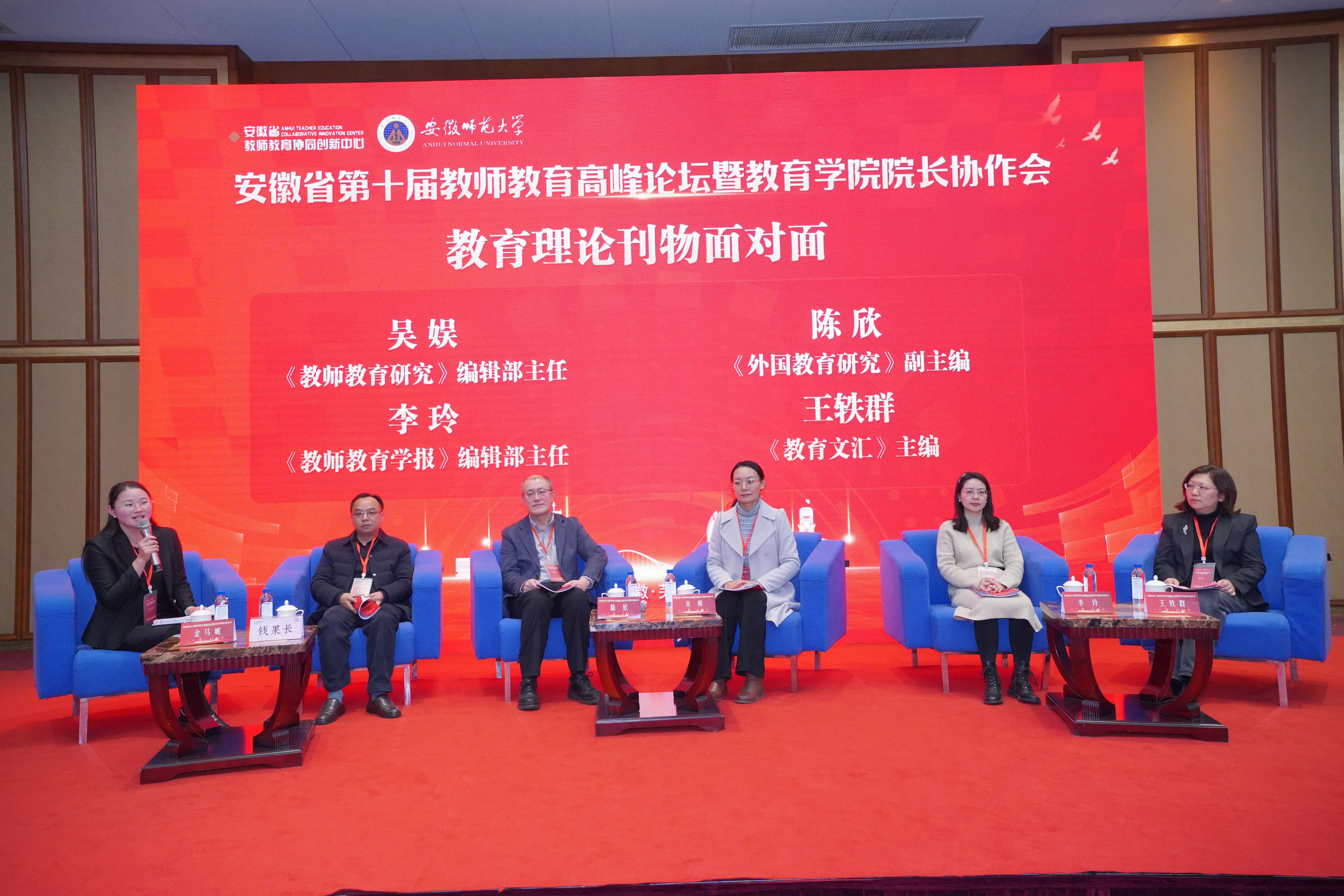 教育理论刊物“面对面”专题活动由安徽师范大学金马妮博士主持,《教师教育研究》编辑部主任吴娱、《外国教育研究》副主编陈欣、《教师教育学报》编辑部主任李玲、《教育文汇》主编王轶群、《安徽师范大学学报》(社会科学版)资深编辑钱果长等嘉宾,围绕“教师教育研究的选题、写作与发表”展开深入交流。