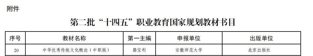 近日,第二批“十四五”职业教育国家规划教材书目名单公布,我院路宝利教授主编的《中华优秀传统文化概论(中职版)》成功入选。