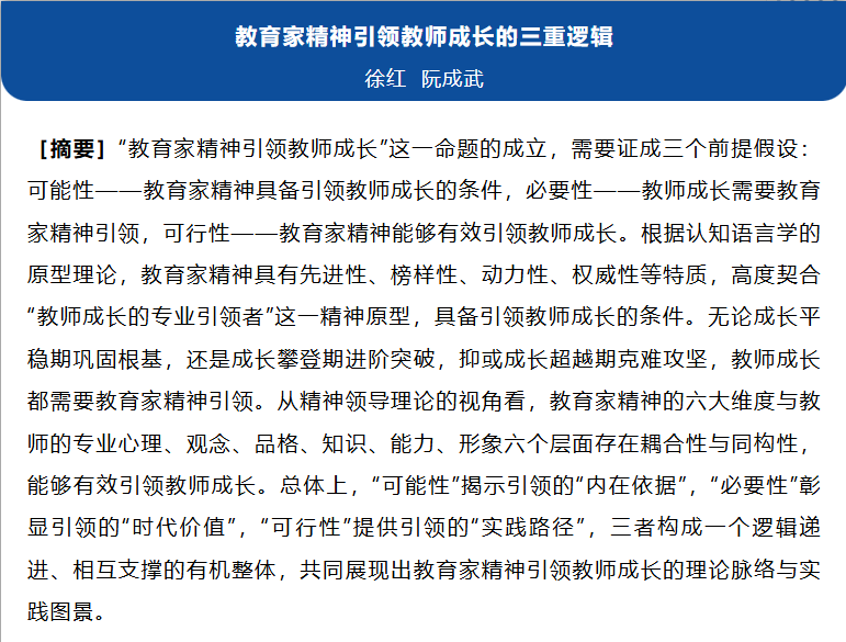 近日,学院徐红、阮成武教授在教育学顶刊《教育研究》2026年第1期合作发表题为《教育家精神引领教师成长的三重逻辑》的研究论文,揭示了教育家精神引领教师成长的理论脉络与实践图景。