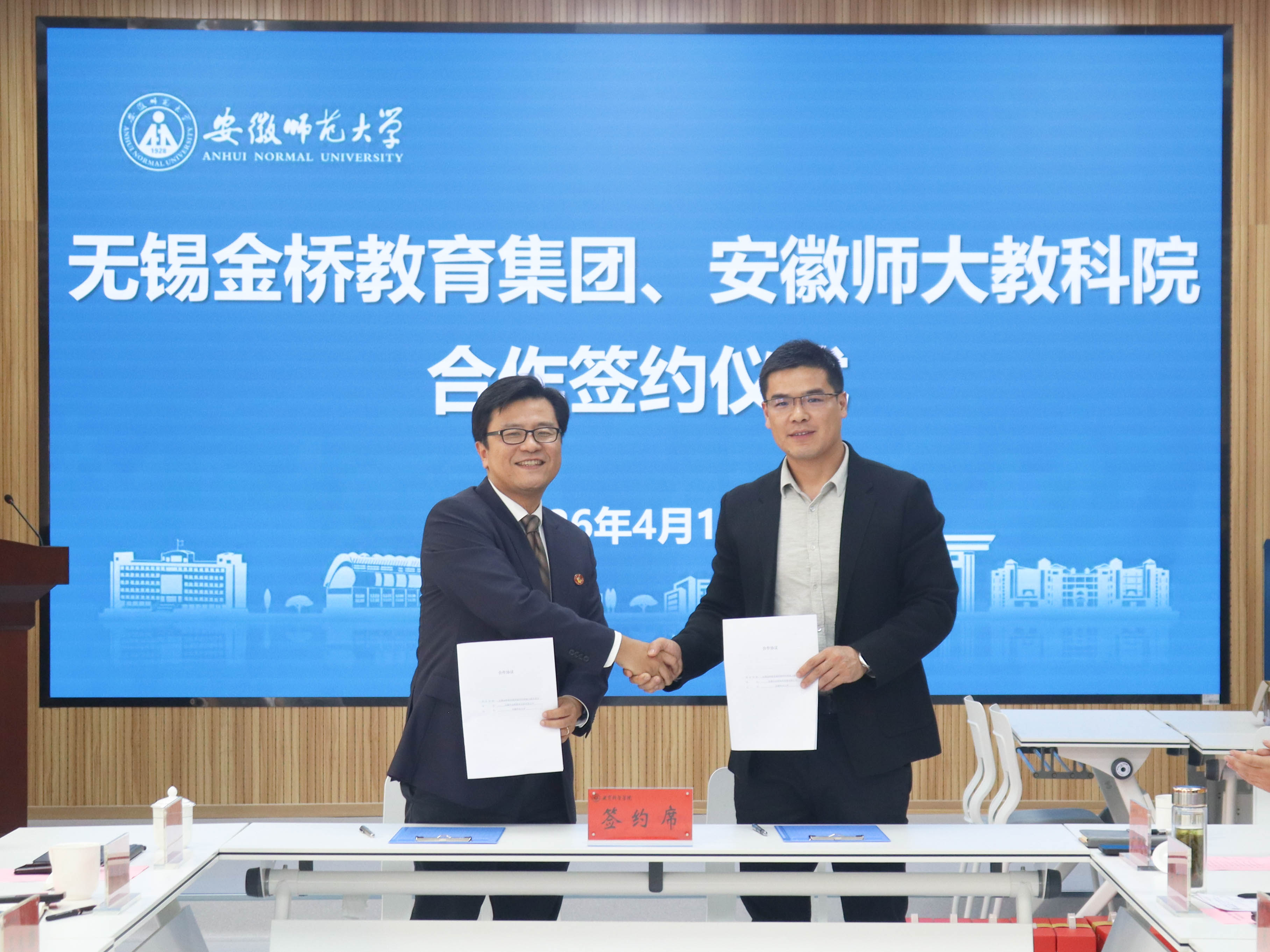 会上,许国飞对马自雄一行的到来表示热烈欢迎,宋波介绍了学校的发展历程与基本情况。马自雄在发言中回顾在校期间所获得的精神财富,充分肯定安师大良好的师生氛围,并指出学校拥有完整的教育链条,期待金桥教育集团能与教科院建立合作关系。马翀介绍集团与学院在资源上的适配性与互补性,并表示期望加强双方的深度合作。随后,双方举行合作签约仪式。