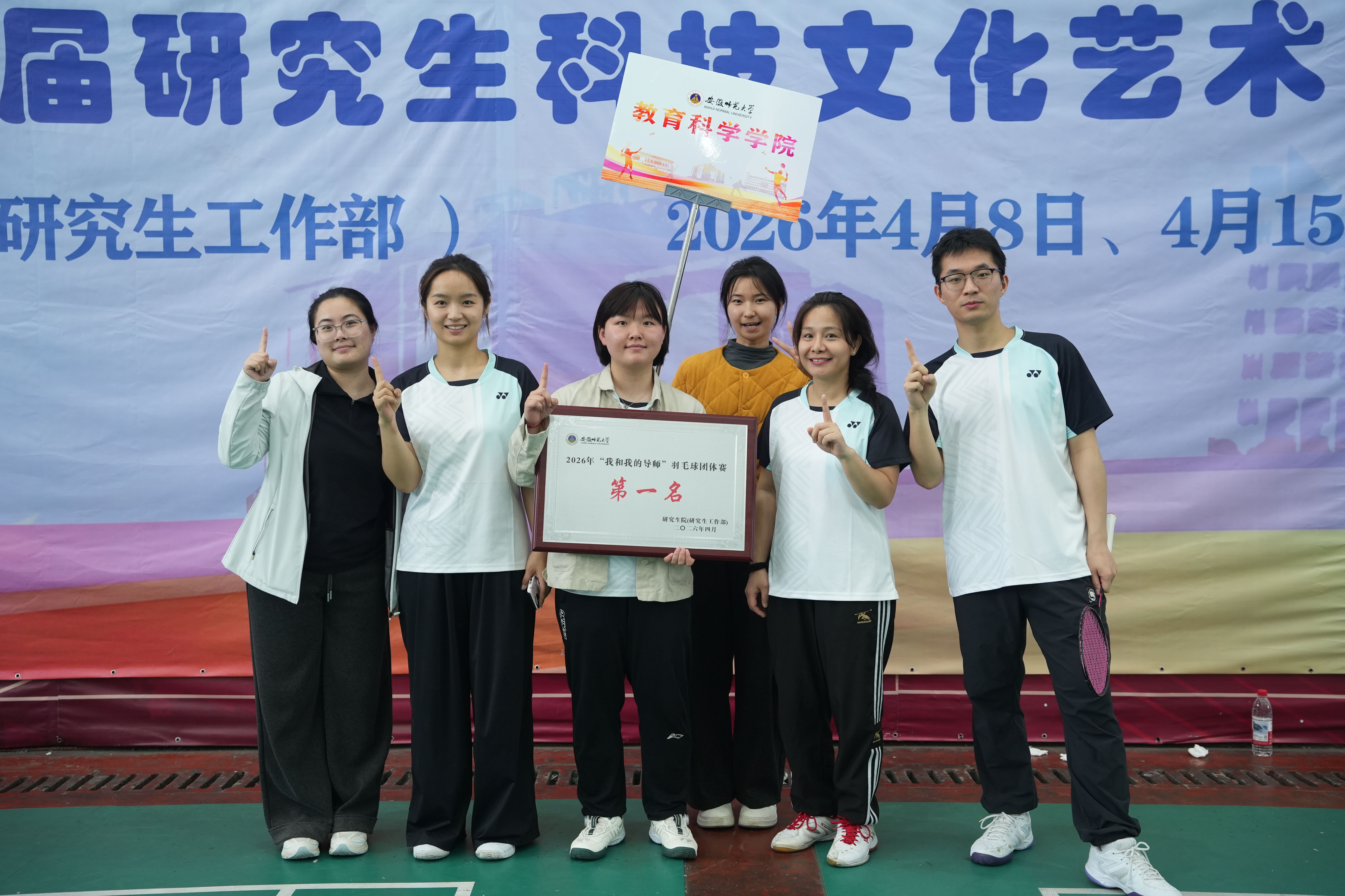 安徽师范大学2026年“我和我的导师”羽毛球团体赛于4月8日至15日在花津校区南体育馆举行,教育科学学院师生代表队团结协作、奋勇拼搏,一路过关斩将,最终夺得团体冠军,充分展现教科师生昂扬向上的精神风貌。