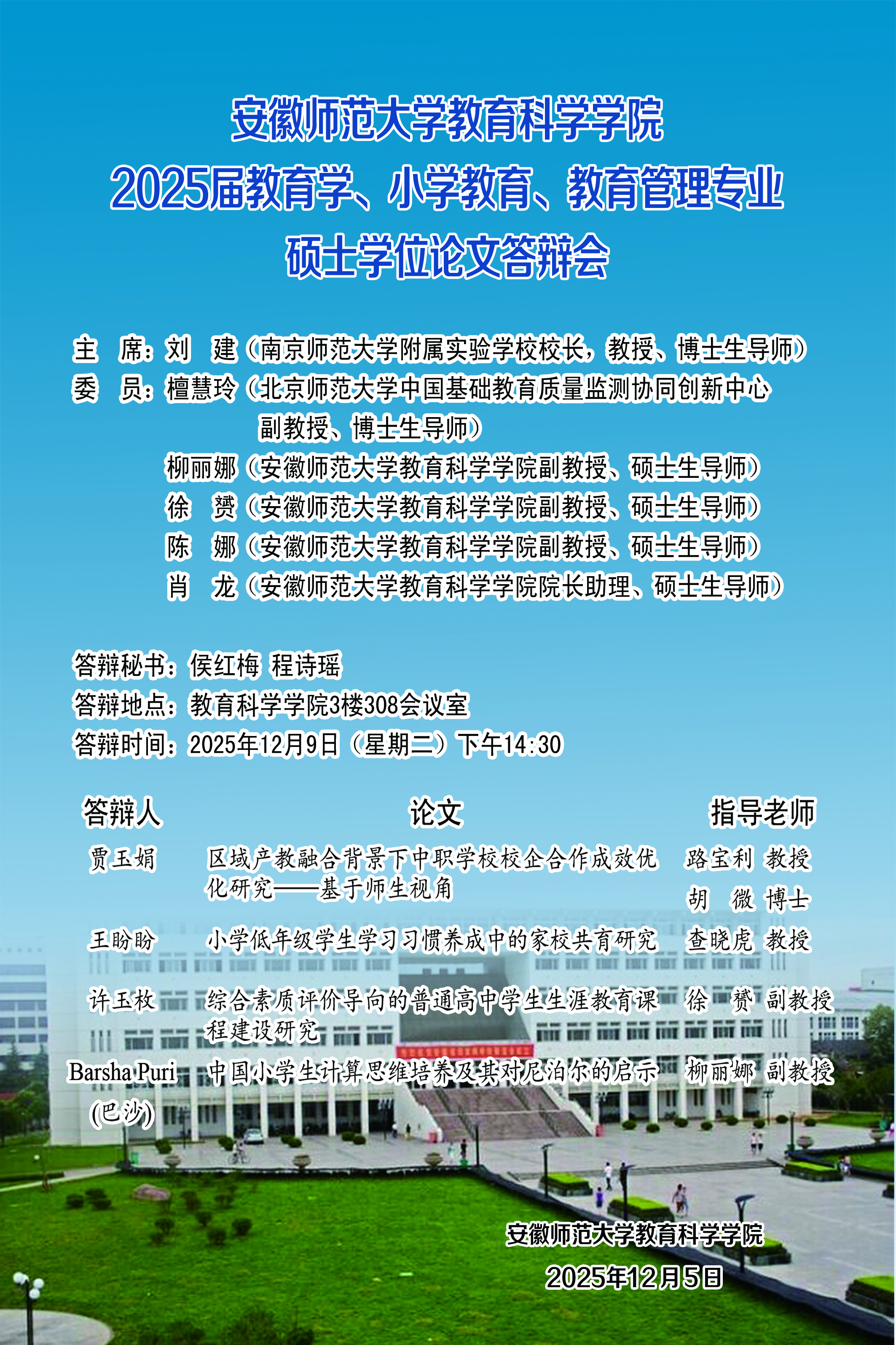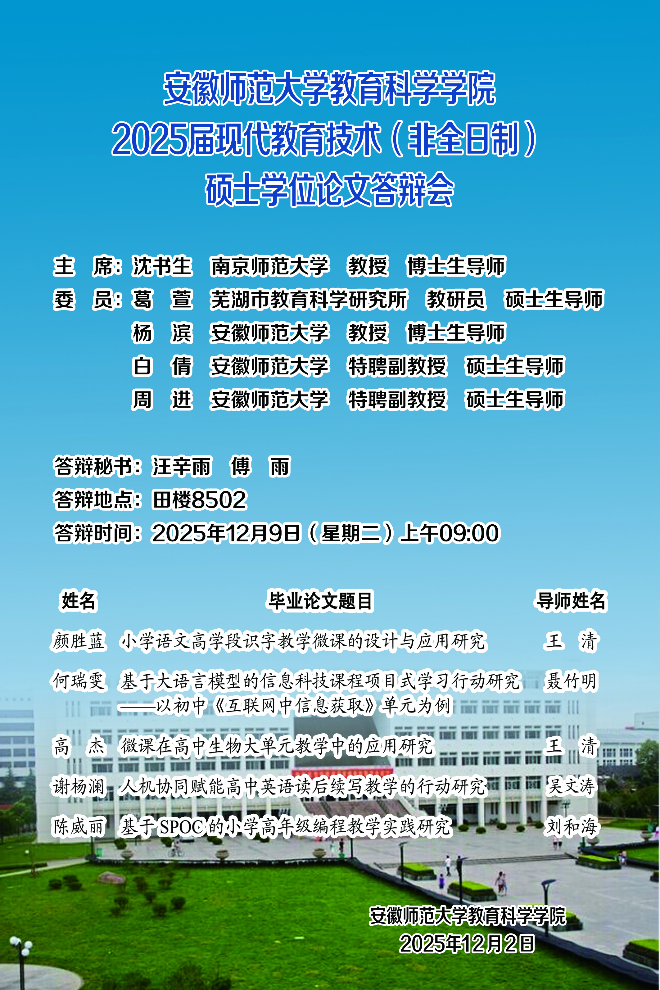 教育科学学院2025年下半年硕士研究生学位论文答辩公告(二)