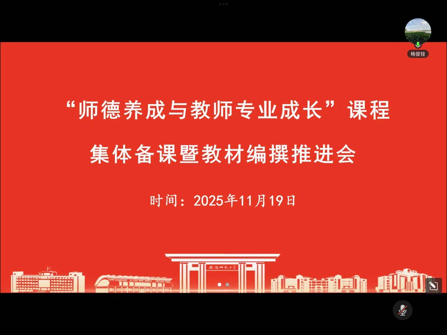 2025年11月19日,全校教师教育课程《师德养成与教师专业成长》教研暨教材编写推进会召开,杨俊铨、位涛、肖龙、刘婉、金马妮、魏晓敏、苏明明、周元宽、杨宝琰等教师参加会议,会议由杨俊铨老师主持,部分课程助教参加旁听。