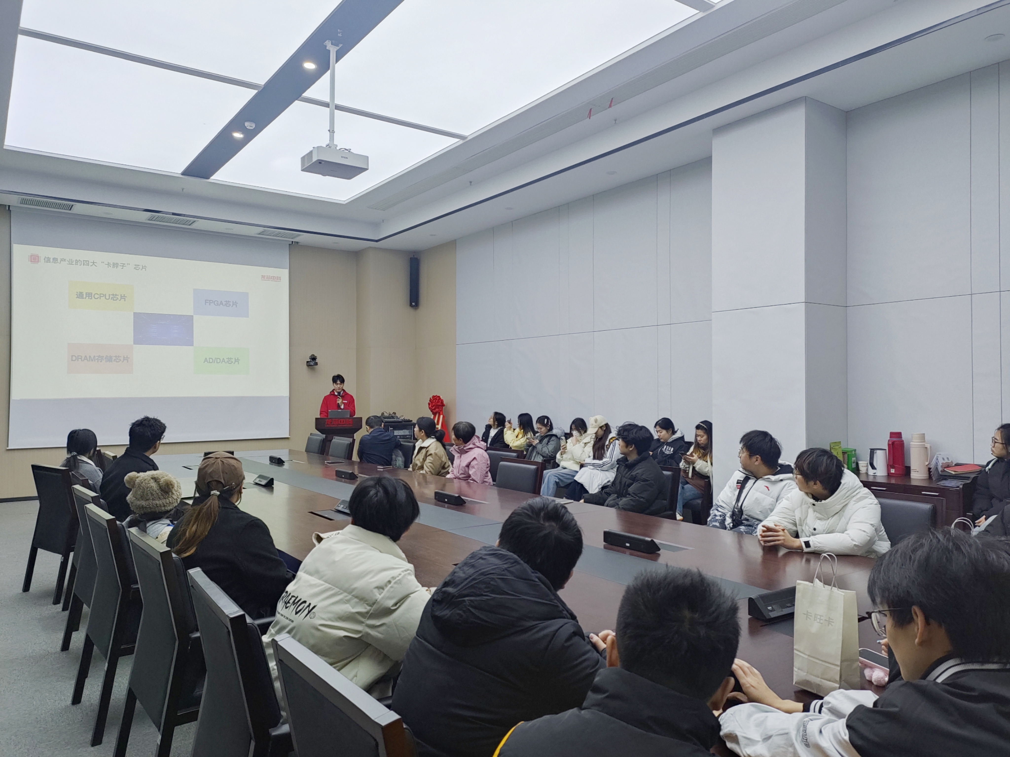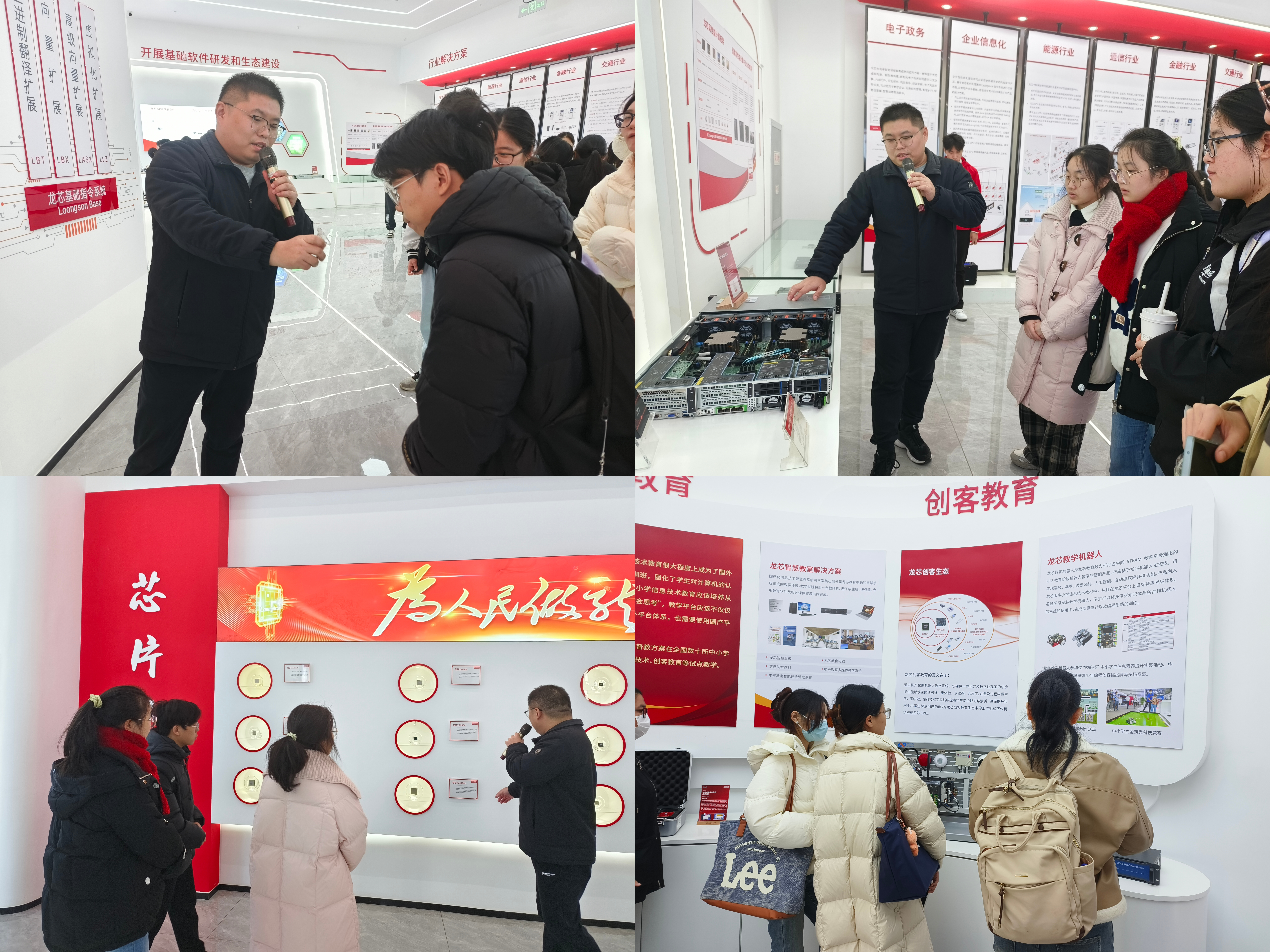随后,师生前往龙芯中科(合肥)技术有限公司进行参观学习。作为我国自主CPU研发的代表性企业,龙芯中科始终坚持从指令集、IP核到芯片设计的全链路自主研发。在讲解员的引导下,同学们系统了解了国产芯片的发展历程、技术体系与产业生态,特别是龙芯在政务、交通、金融、教育等关键领域的国产化实践。通过实物展示与案例讲解,大家对信息技术自主可控的国家战略意义有了更深刻的理解,也对国产芯片的未来发展充满信心。