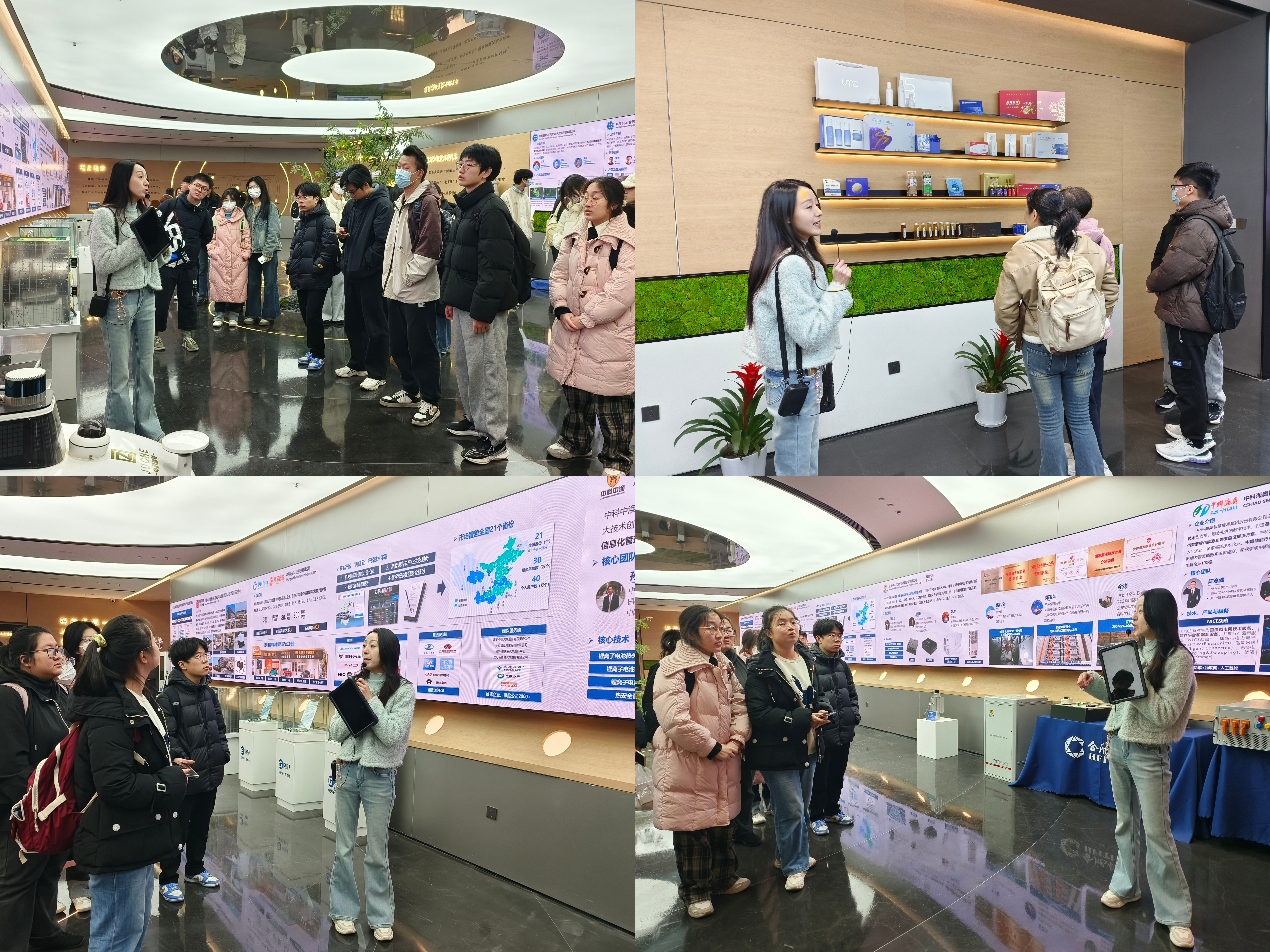 首先,师生一行来到中科院合肥技术创新工程院。作为国家级科技企业孵化器与技术转移示范机构,该院已成功孵化企业超过400家,其中包括81家国家高新技术企业。在展厅中,同学们实地观摩了园区的智慧化管理平台。该平台融合物联网、大数据与数字孪生技术,实现了对园区能源、安防、设备等的实时监测与低碳管控。通过现场演示,同学们直观体会到科技创新如何赋能园区运维,并对“AI+产业”的融合应用有了生动认识。
