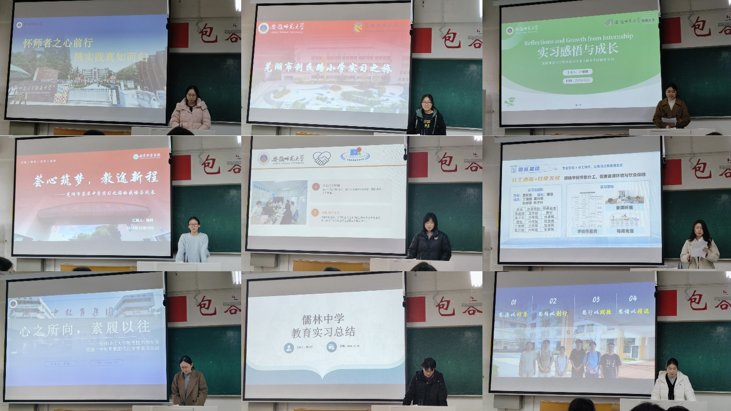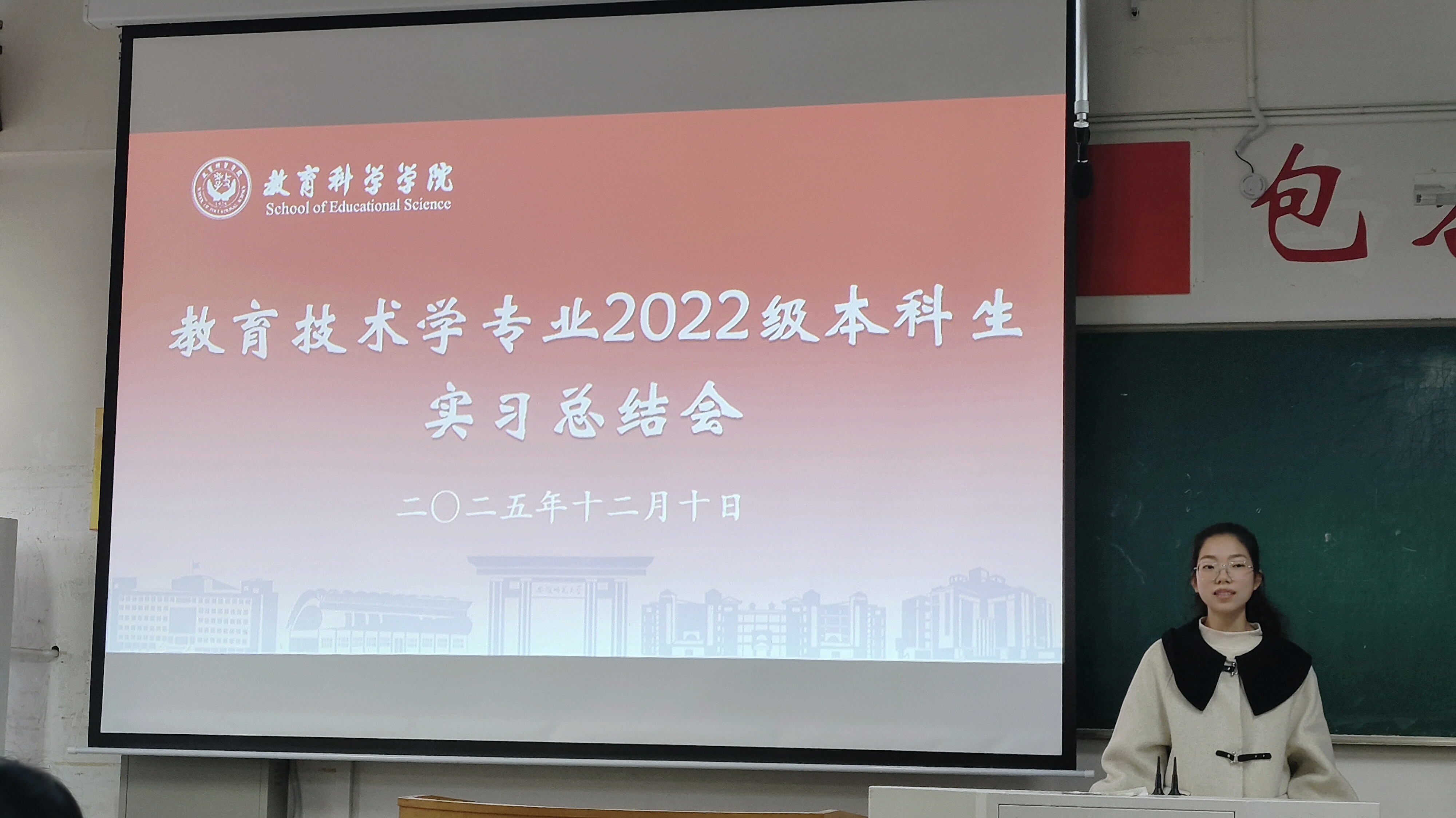 紧接着,各实习小组代表和申报优秀实习生的同学们依次进行汇报。每组汇报人从实习期间的基本情况、教学工作、班主任工作、所遇挑战与解决方法以及未来展望等多个方面,详细总结了自己在实习过程中的所思所感。汇报中,不少同学分享了在实习学校的多元体验:有的学校引入了人工智能教育产品,如“机器狗”进课堂,激发了学生们对科技的兴趣,实习同学也借此开展了STEAM课程设计与实践;有的同学参与了所在学校的运动会、文化节、社团节等大型活动的组织,在实战中锻炼了协调与执行力;所有同学深度体验了班主任的日常工作,从早自习到晚辅导,从班会课到个别谈心,与学生们建立了深厚的情感联结。这些真实而丰富的教育场景,让同学们深刻体会到“教育是生命影响生命”的过程,也展现了22级教育技术学子勇于实践、善于创新、不断进步的精神风貌。