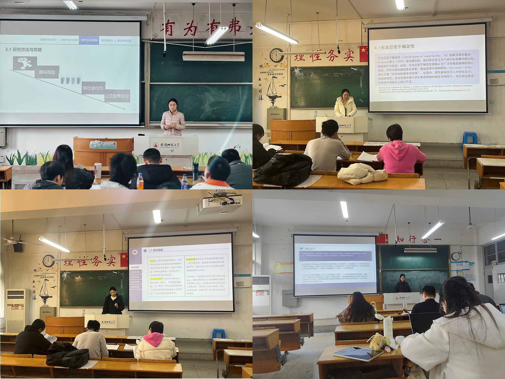本次开题汇报主要包括学生陈述与教师提问两个环节。同学们围绕论文选题背景与意义、国内外研究动态、研究思路与方法等方面进行系统阐述。选题内容涉及发展与教育心理学、社会心理学、认知心理学与心理健康等多个领域,既有对学科经典问题的深入探讨,也有对接现实需求的应用研究,展现出同学们开阔的学术视野和积极的问题意识。