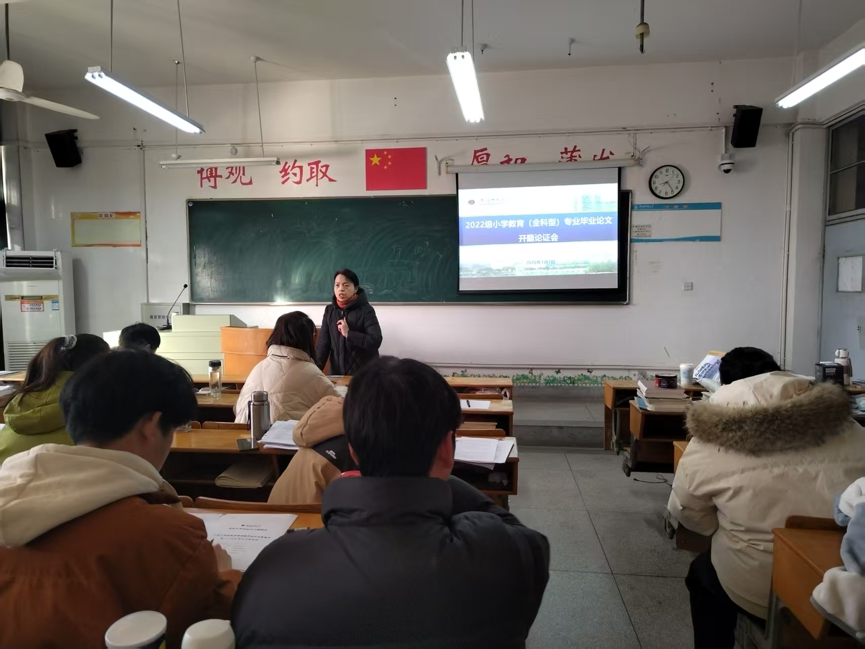 教育科学学院22级小学教育(全科型)专业第七学期开展毕业论文开题论证工作。上一学期末起,在专业负责人王芳统筹安排下,全体学生以小组为单位明确指导教师,经选题研讨、文献梳理、框架搭建及导师多轮指导,完成开题报告撰写与修改完善,为论证会顺利开展筑牢基础。2026年1月7日,本专业毕业论文开题论证会在学院顺利举行,全体学生分组参与,学院领导、专业教师及指导教师组成评审小组,为学生研究方向把关定向。