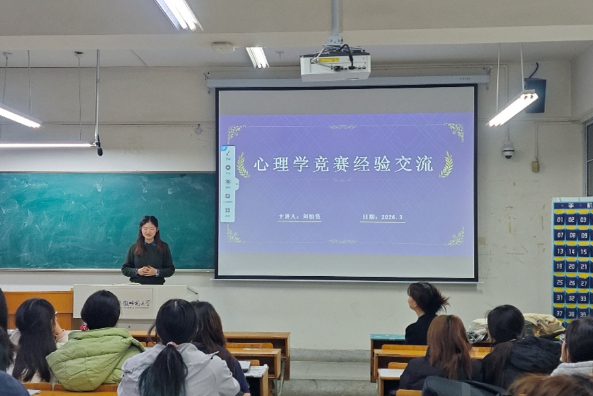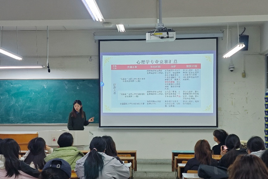 为积极备战第三届安徽省高校心理学专业本科生创新创业论坛暨第二届安徽省应用心理专业学位研究生实践技能大赛,提升本科生学科竞赛参与度与竞争力,3月26日晚,教育科学学院2025级心理学1班在田楼8211举行“心理学专业竞赛经验分享”主题班会。本次班会由班主任倪雨菡主持,特邀2023级心理学专业优秀本科生代表刘怡资担任主讲嘉宾,围绕备赛经验与实战技巧展开深入交流,现场气氛热烈,互动踊跃。
