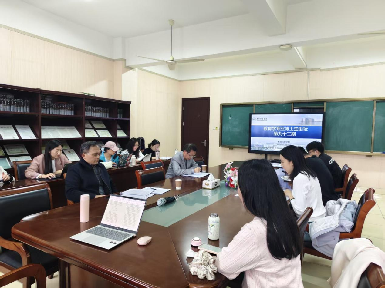 2026年4月12日下午,教育科学学院教育学专业第九十二期博士生论坛在教科院408教室开展。本次论坛的指导教师为余俊教授、周元宽教授,芮箕俊、晋文艳、崔凯三位博士生就自己近期的研究问题进行了汇报,我院在校的一、二年级博士生参加了本期论坛。