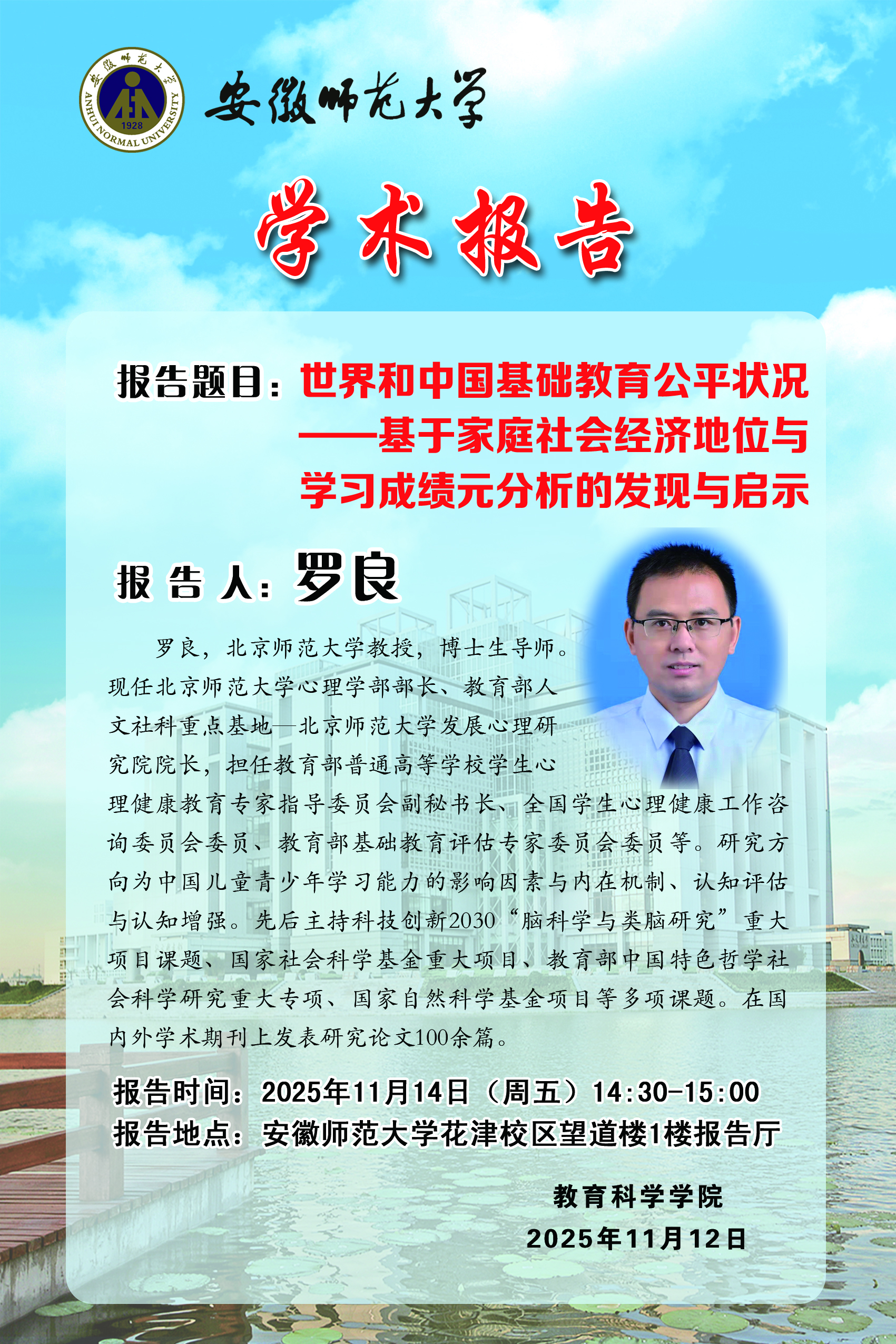 【学术预告】罗良:世界和中国基础教育公平状况——基于家庭社会经济地位与学习成绩元分析的发现与启示