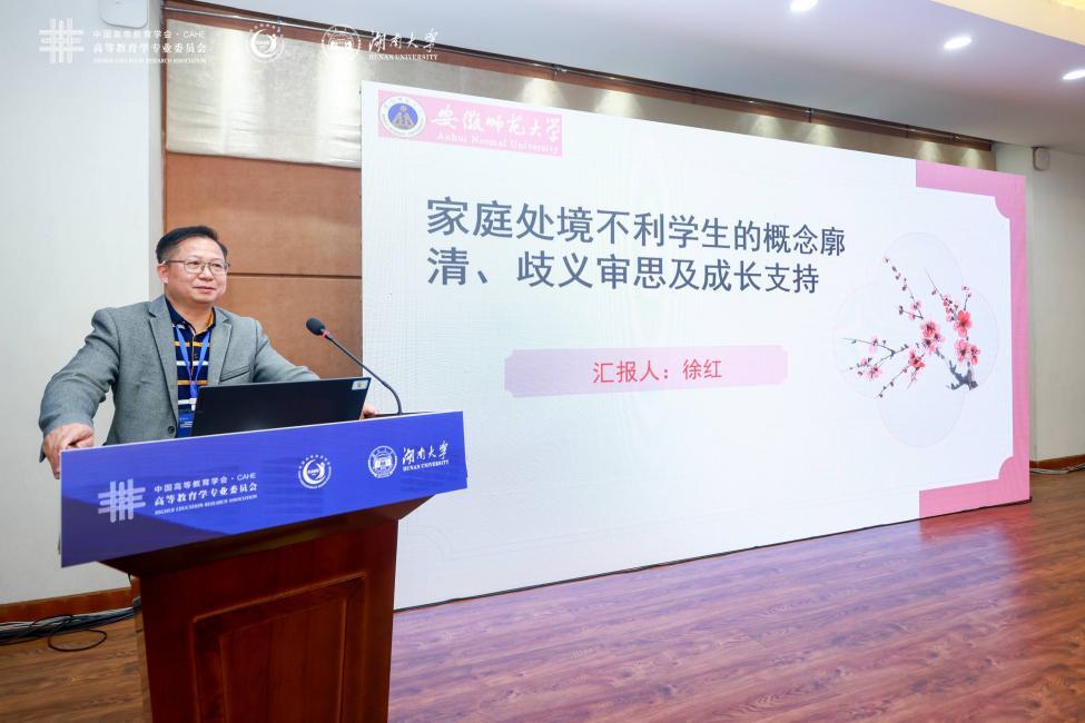 开幕式结束后,学术年会进入分场报告环节。与会学者围绕高等教育强国理论、布局结构、学科专业调整、数字赋能教育等关键议题展开了深入研讨。我院徐红教授受邀做了题为《家庭处境不利学生的概念廓清、歧义审思及成长支持》的报告,他提出,为化解因对家庭处境不利学生的理解偏差而诱发的问题,促进家庭处境不利学生积极成长,当前应精准理解家庭处境不利学生之义,完善教育公平政策精准救济机制,加大社会主义和谐社会建设力度,健全现代教育功利主义矫正机制。