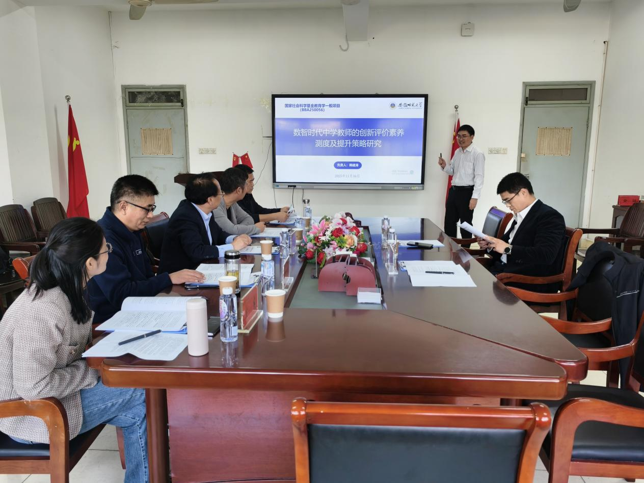 2025年11月16日,国家社科基金2025年度课题开题报告会如期举办。此次开题的是韩建涛教授主持的国家社科基金2025年度教育学一般项目“数智时代中学教师的创新评价素养测度及提升策略研究”(课题编号BBA250056)。学院特邀华东师范大学大夏书院院长、上海市心理学会理事长庞维国教授,华中师范大学心理学院副院长赵庆柏教授,安徽师范大学教授宣宾、赵必华、尹达以及学院部分师生,参加了开题报告会。开题报告会由安徽师范大学教育科学学院院长吴文涛教授主持。
