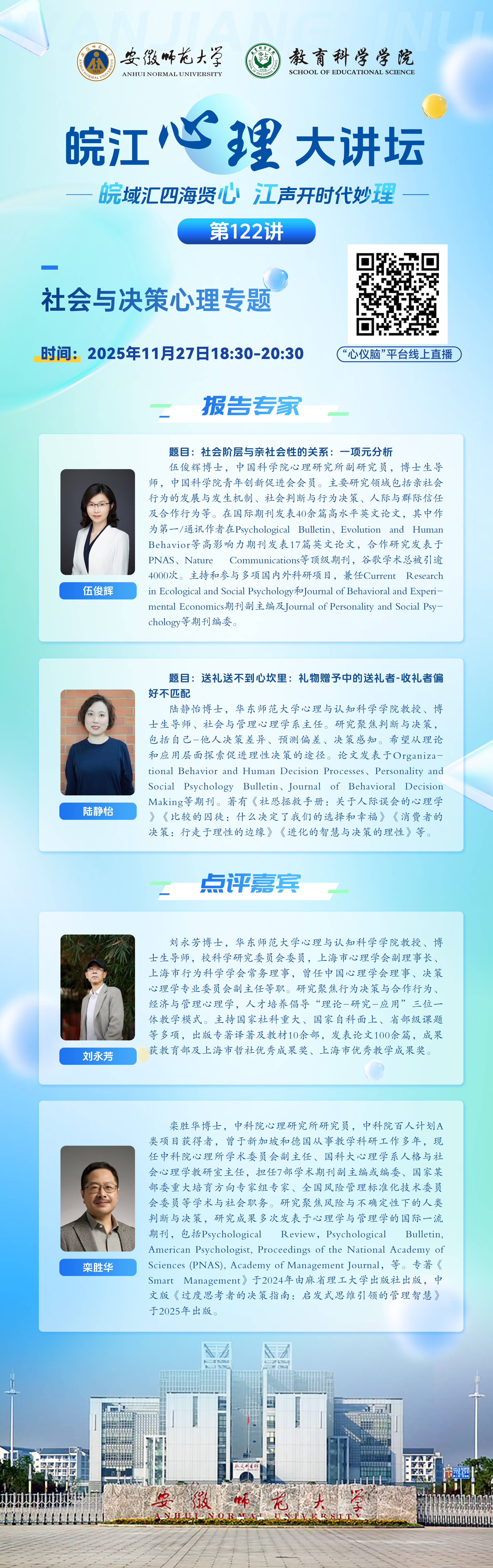 【学术预告】皖江心理大讲坛第一百二十二讲——社会与决策心理专题