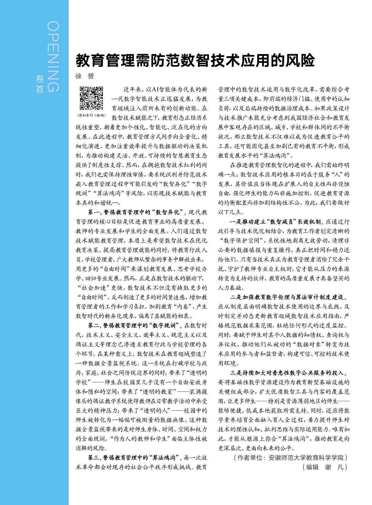 近年来,以AI智能体为代表的新一代数字智能技术正迅猛发展,为教育领域注入前所未有的创新动能。在数智技术赋能之下,教育形态正经历系统性重塑,朝着更加个性化、智能化、泛在化的方向发展。在此进程中,教育管理方式同步向全量化、精细化演进,更加注重效率提升与数据驱动的决策机制,为推动构建灵活、开放、可持续的智慧教育生态提供了制度性支撑。然而,在拥抱数智技术红利的同时,我们也需保持理性审慎,要系统识别并防范技术嵌入教育管理过程中可能引发的“数智异化”“数字规训”“算法鸿沟”等风险,以实现技术赋能与教育本真的和谐统一。
