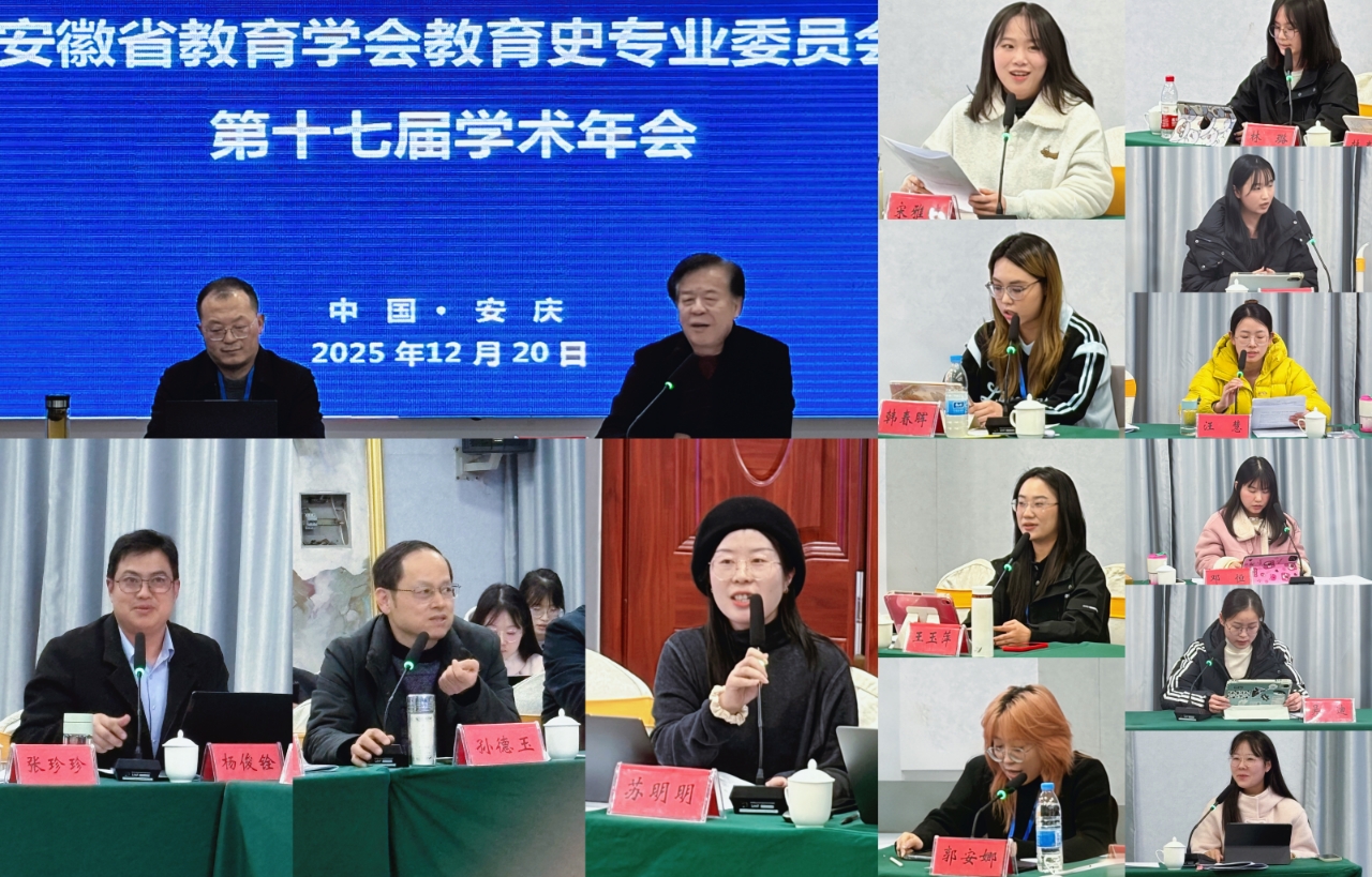 2025年12月20日至21日,安徽省教育学会教育史专业委员会第十七届学术年会顺利召开。本次会议由安徽省教育学会教育史专业委员会主办、安庆师范大学教育学院承办,以“推进教育强国建设的历史镜鉴研究”为主题。我院孙德玉、姚运标、杨俊铨、苏明明等教师及十位教育史专业研究生参会。