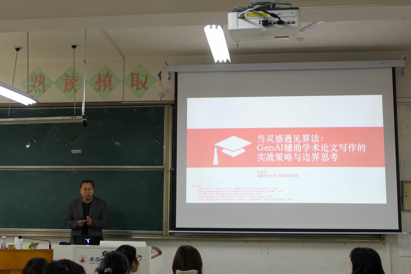 本网讯(图/邓天冉 文/乔琳颖)12月19日上午十点,教育科学学院在田楼8103教室成功举办第五十期赭山青年论坛。学院青年教师徐刘杰担任主讲嘉宾,以《当灵感遇见算法:AIGC辅助学术论文写作的实战策略与边界思考》为题,为学院师生带来精彩分享。报告由院研究生会李欣遥同学主持。