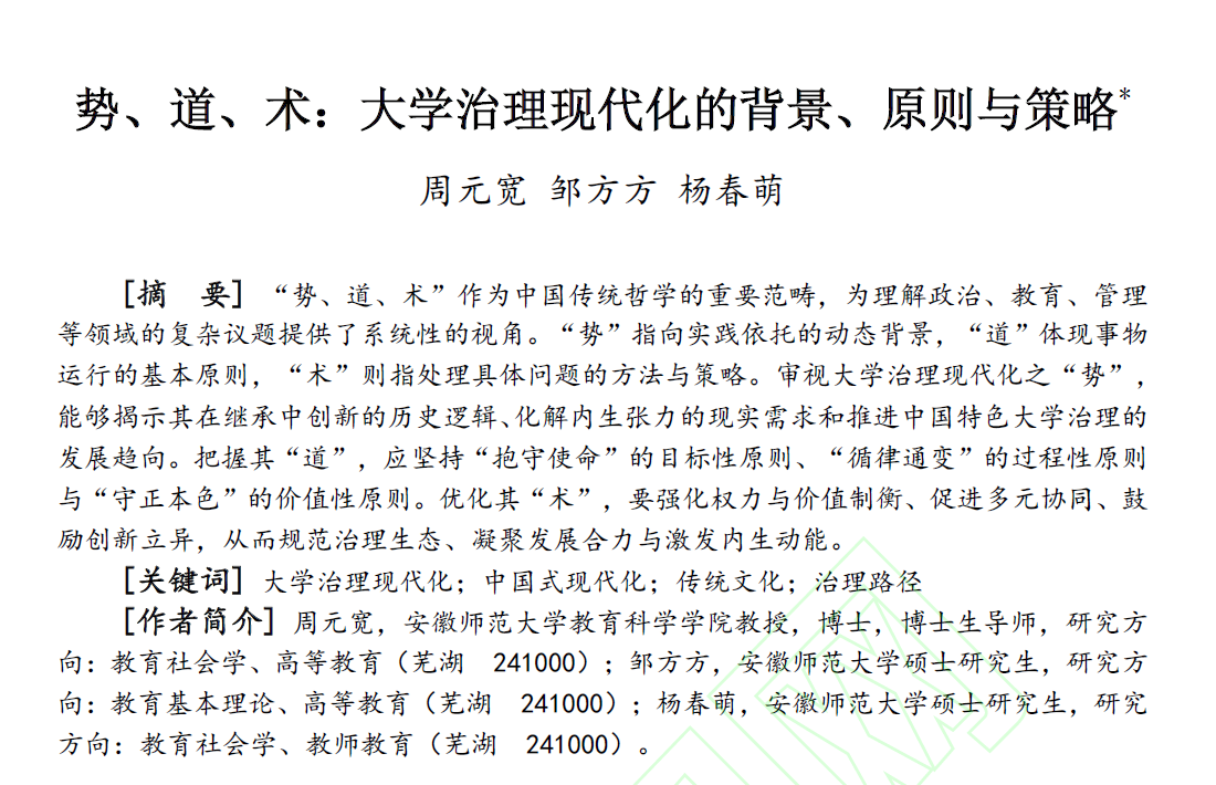 “势、道、术”作为中国传统哲学的重要范畴,为理解政治、教育、管理等领域的复杂议题提供了系统性的视角。“势”指向实践依托的动态背景,“道”体现事物运行的基本原则,“术”则指处理具体问题的方法与策略。审视大学治理现代化之“势”,能够揭示其在继承中创新的历史逻辑、化解内生张力的现实需求和推进中国特色大学治理的发展趋向。把握其“道”,应坚持“抱守使命”的目标性原则、“循律通变”的过程性原则与“守正本色”的价值性原则。优化其“术”,要强化权力与价值制衡、促进多元协同、鼓励创新立异,从而规范治理生态、凝聚发展合力与激发内生动能。