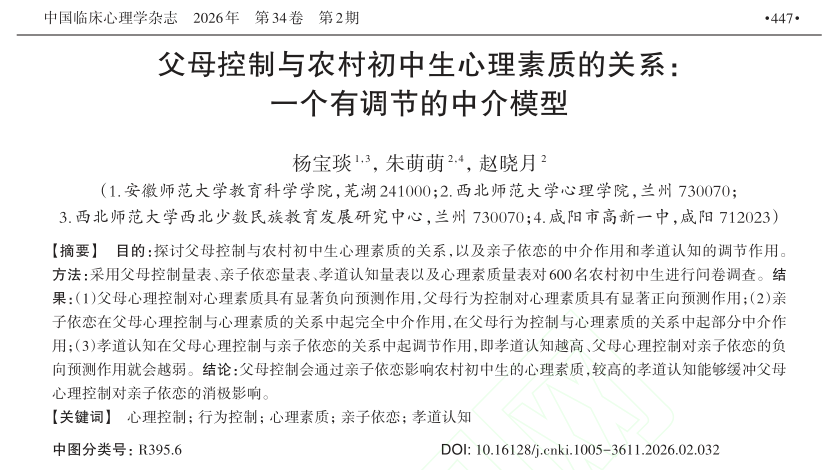 目的:探讨父母控制与农村初中生心理素质的关系,以及亲子依恋的中介作用和孝道认知的调节作用。方法:采用父母控制量表、亲子依恋量表、孝道认知量表以及心理素质量表对 600 名农村初中生进行问卷调查。结果:(1)父母心理控制对心理素质具有显著负向预测作用,父母行为控制对心理素质具有显著正向预测作用;(2)亲子依恋在父母心理控制与心理素质的关系中起完全中介作用,在父母行为控制与心理素质的关系中起部分中介作用;(3)孝道认知在父母心理控制与亲子依恋的关系中起调节作用,即孝道认知越高、父母心理控制对亲子依恋的负向预测作用就会越弱。结论:父母控制会通过亲子依恋影响农村初中生的心理素质,较高的孝道认知能够缓冲父母心理控制对亲子依恋的消极影响。