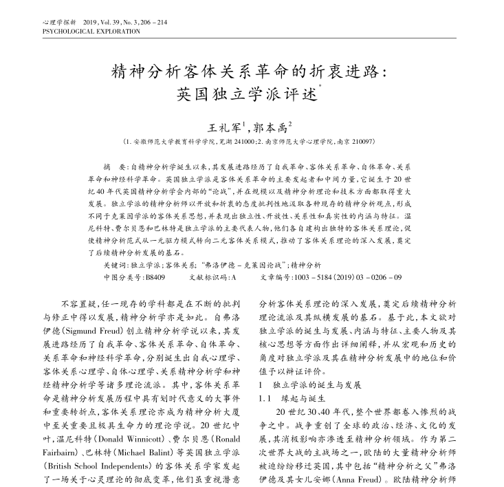 王礼军,郭本禹:精神分析客体关系革命的折衷进路:英国独立学派评述