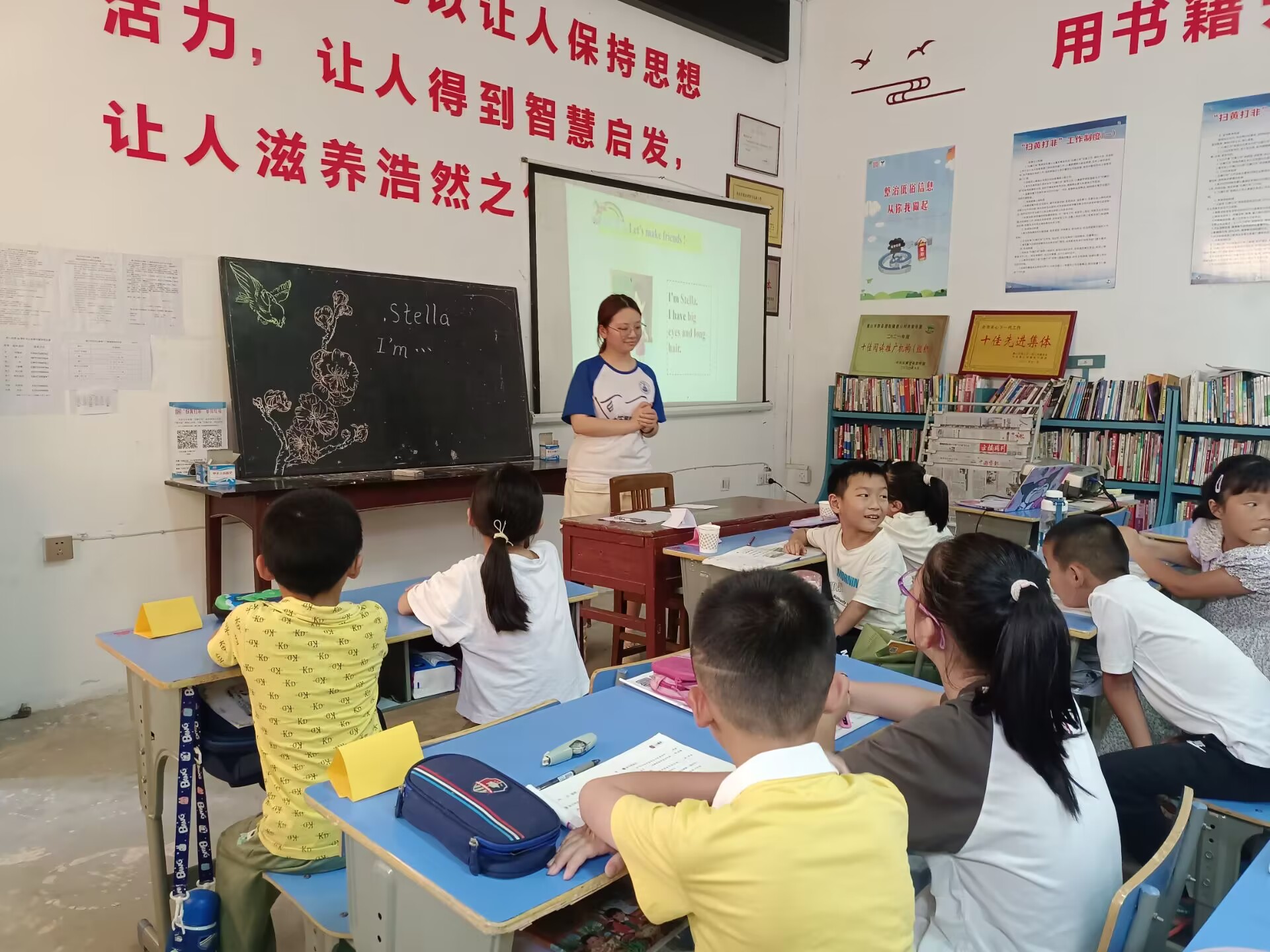 在下午的英语课上,队员董宇鼓励同学们主动用英语介绍自己的名字,活跃课堂氛围。她采取绘本故事的形式让同学们更积极参与到英语学习之中,让课堂变得更加生动有趣。在她的带领下,在孩子的欢声笑语中,今天的课程圆满结束。