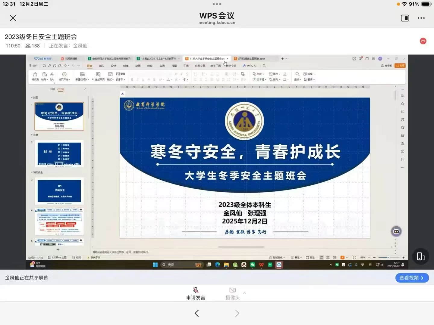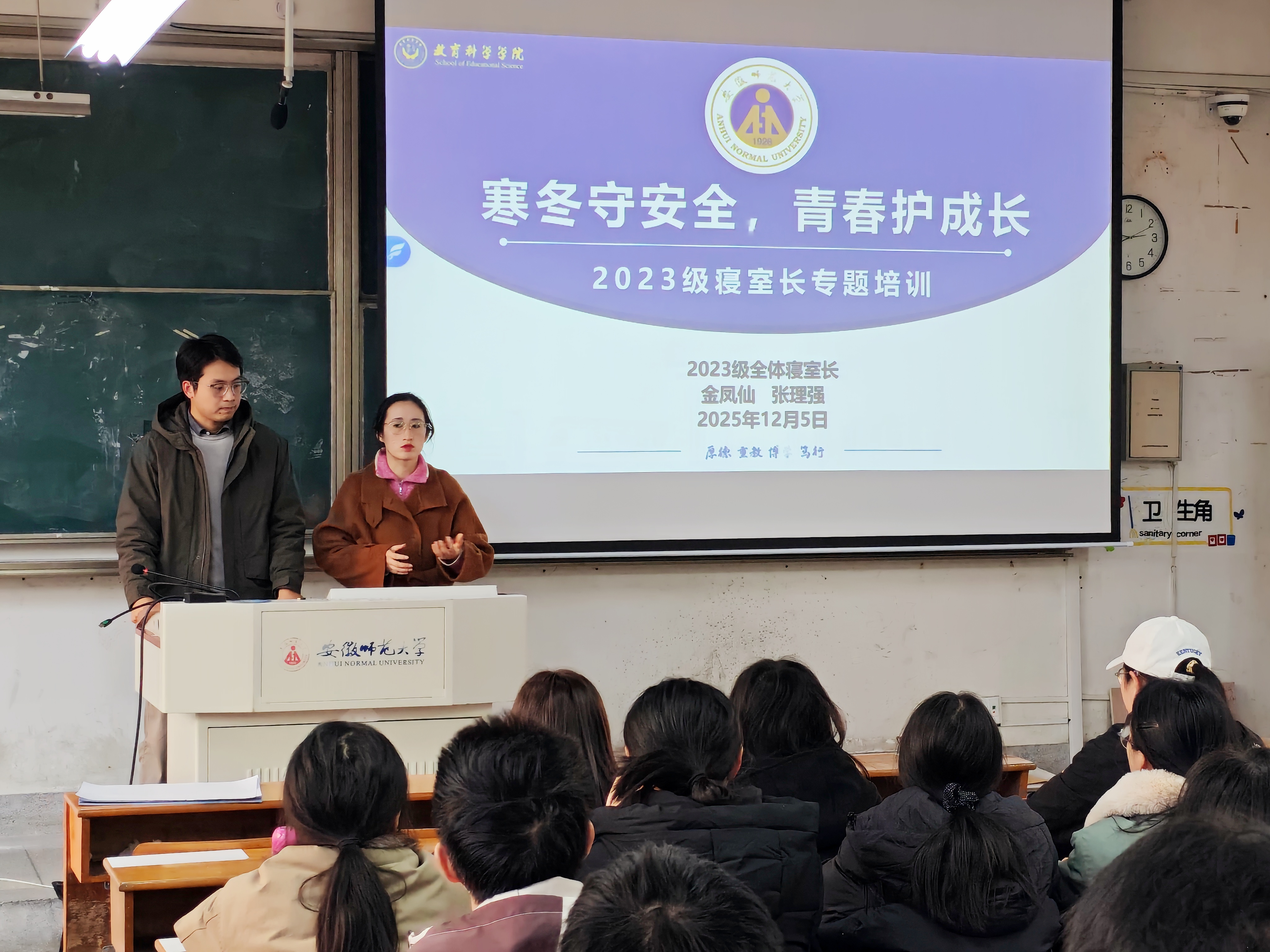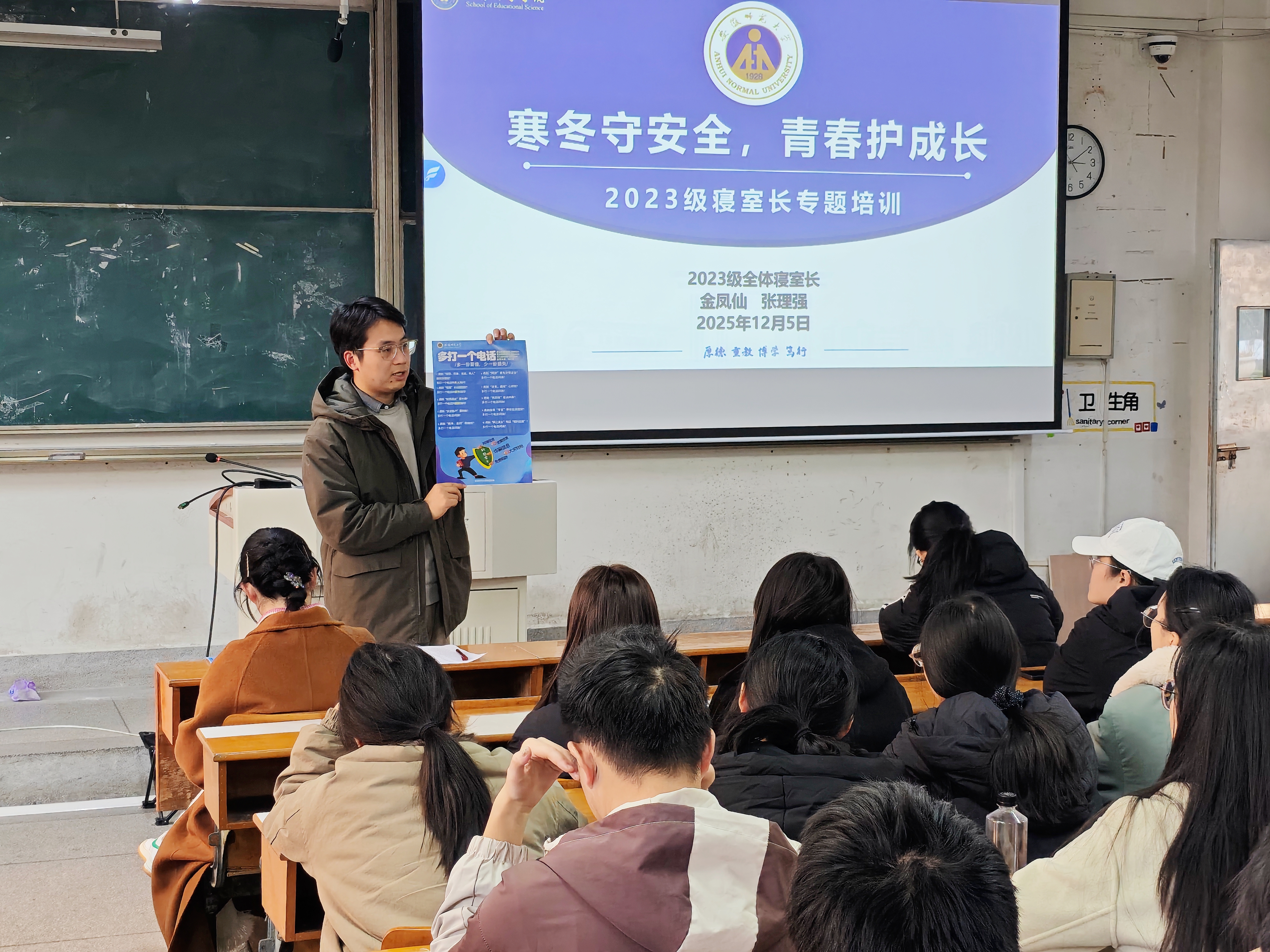 为切实强化学生安全防范意识,规范日常管理秩序,助力期末备考顺利推进,12月上旬,教育科学学院2023级以线上线下相结合的形式召开冬季安全主题班会与寝室长专项工作布置会议,围绕安全防护、心理健康、学业管理等核心议题,给同学们全方位的成长指引,会议由2023级本科生辅导员金凤仙、张理强主持、主讲,2023级全体本科生参与。