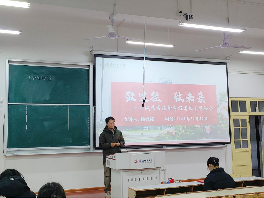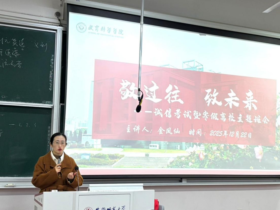 为强化学生诚信应考意识,明确学生生涯规划,并做好假期离校相关安排,12月22日,2023级本科生在教学楼组织召开“敬过往 致未来”诚信考试主题暨离校班会,班会由2023级专职辅导员金凤仙、张理强主持主讲,2023级全体本科生参与。