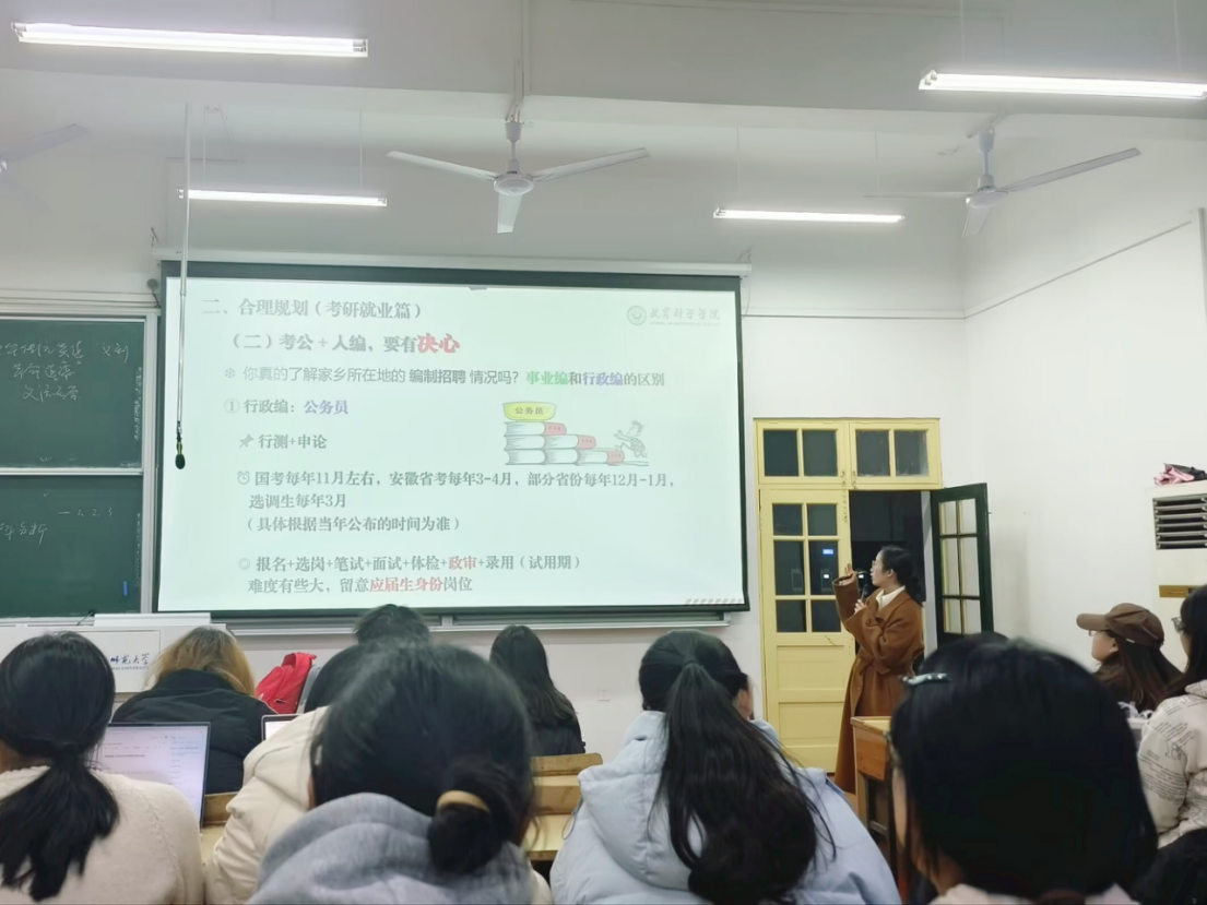 2位老师着重强调了科学规划的重要性。他们指出时间紧迫,同学们应以终为始,尽早确立清晰的目标。无论是选择“研”途深造,还是准备考编、考公或定向就业,都需要恒心与毅力。会上,2位老师还分享了相关的资源信息库与权威网站,为同学们搜集信息、积极备考提供了有力支持。