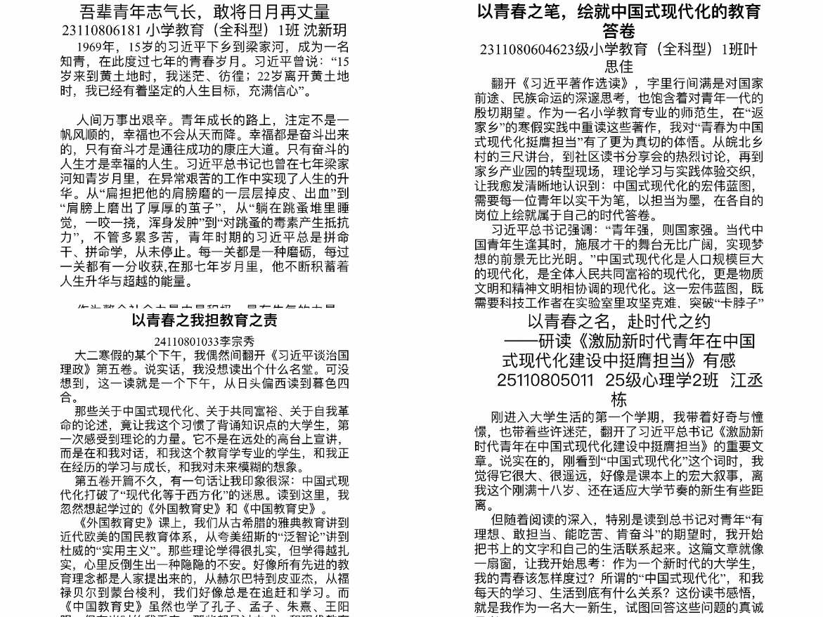 青春激扬,践行使命担当。路虽远,行则将至;事虽难,做则必成,为引导广大同学在青春赛道上奋力奔跑,学院积极组织“创新创业”与“青春共读”两门课程。同学们在敢闯会创中锤炼过硬本领,在思想碰撞中坚定理想信念,明确“为中国式现代化挺膺担当”的奋斗航向。