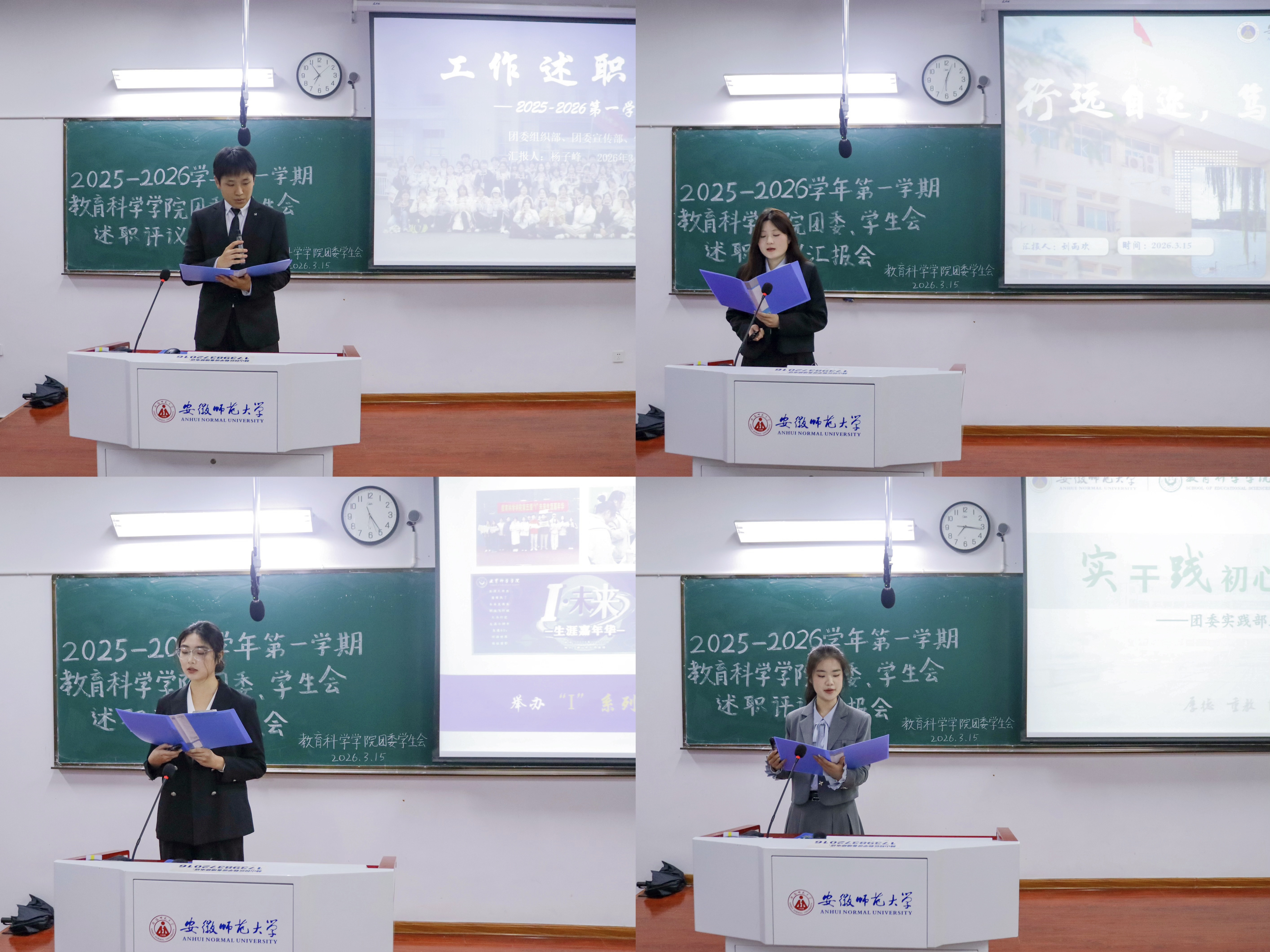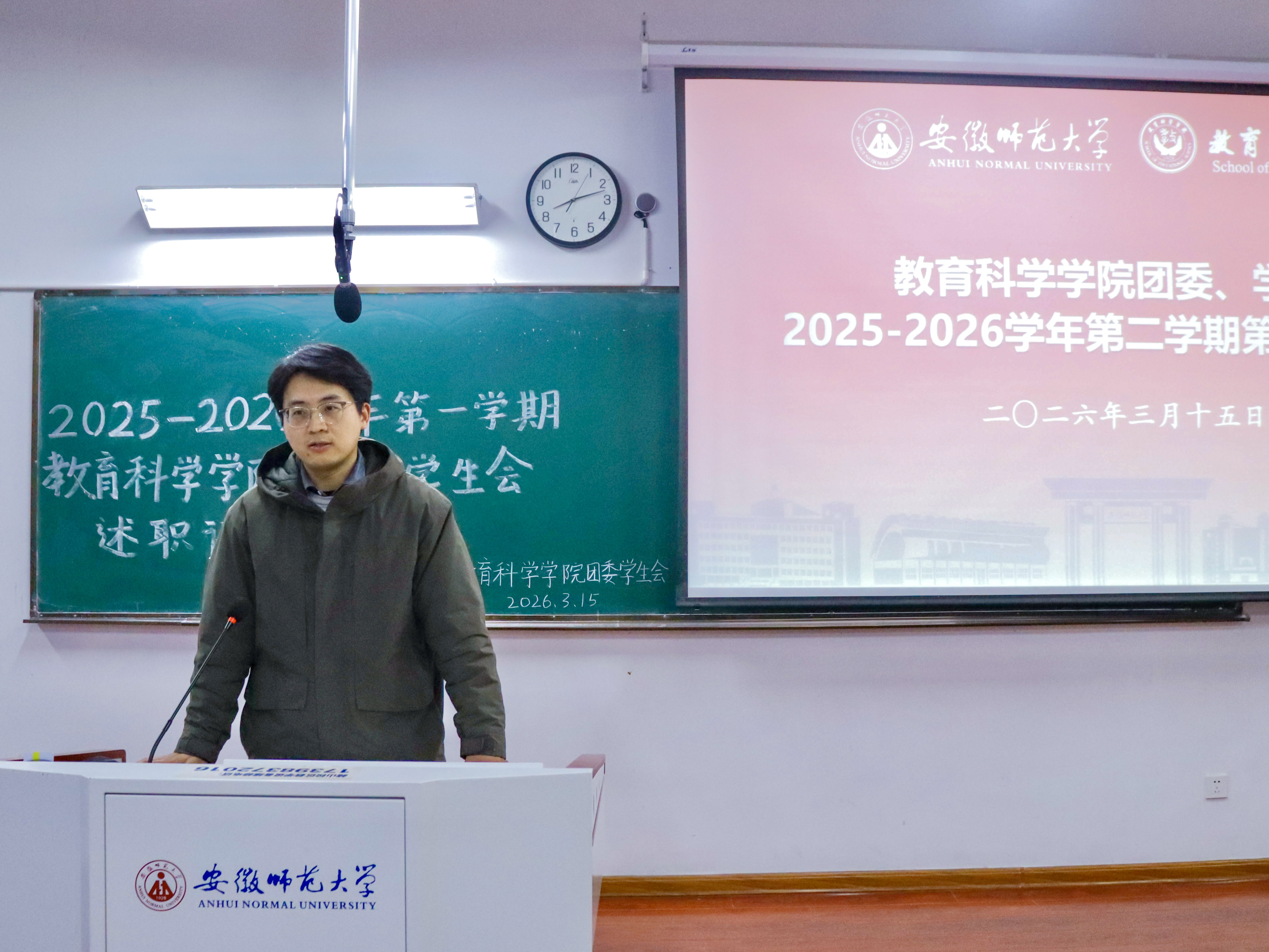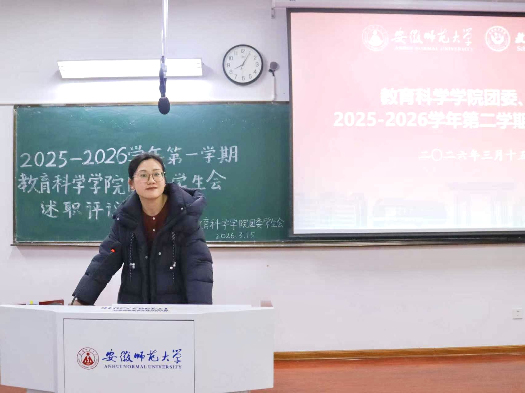 2026年3月15日晚,教育科学学院于赭山校区教学楼1409教室开展2025-2026学年第一学期团委、学生会述职评议汇报会暨新学期第一次全委会。院团委书记张理强,院团委副书记赵茜,校学生会主席团成员张立云,院团委、学生会全体成员及2025级学生代表参加此次会议。