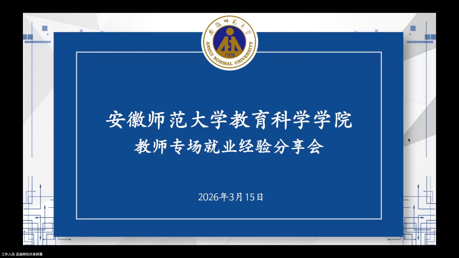 本网讯(教科院 乔琳颖)3月15日晚,教育科学学院研究生会以线上腾讯会议形式举办教师专场就业经验分享会,邀请就职于合肥清华附中的2025届小学教育专业校友马丽分享求职备考经验。研究生会指导教师莫大贡出席指导,部分研究生参与本次活动,分享会由研会校友部孟淑婷主持。
