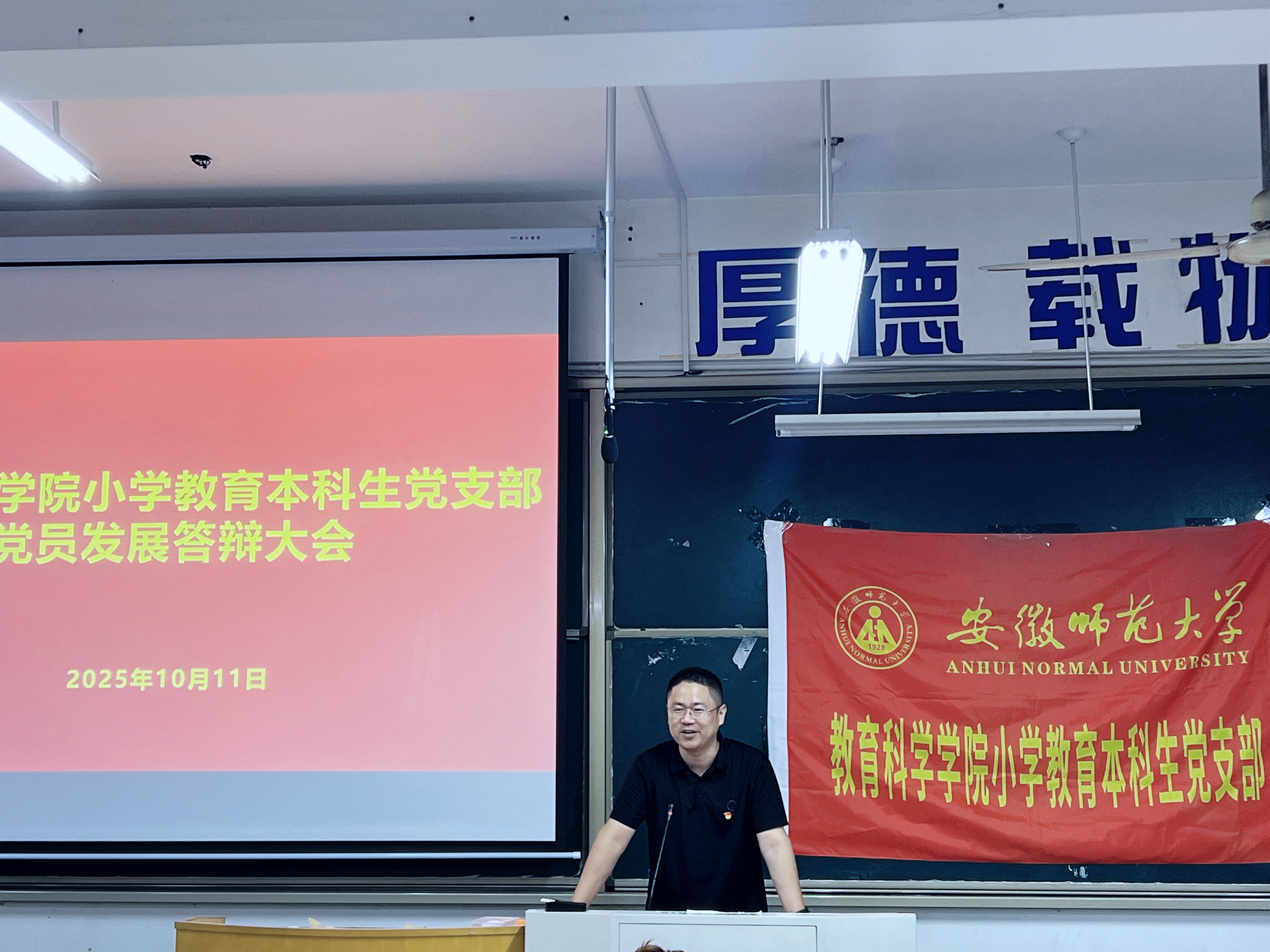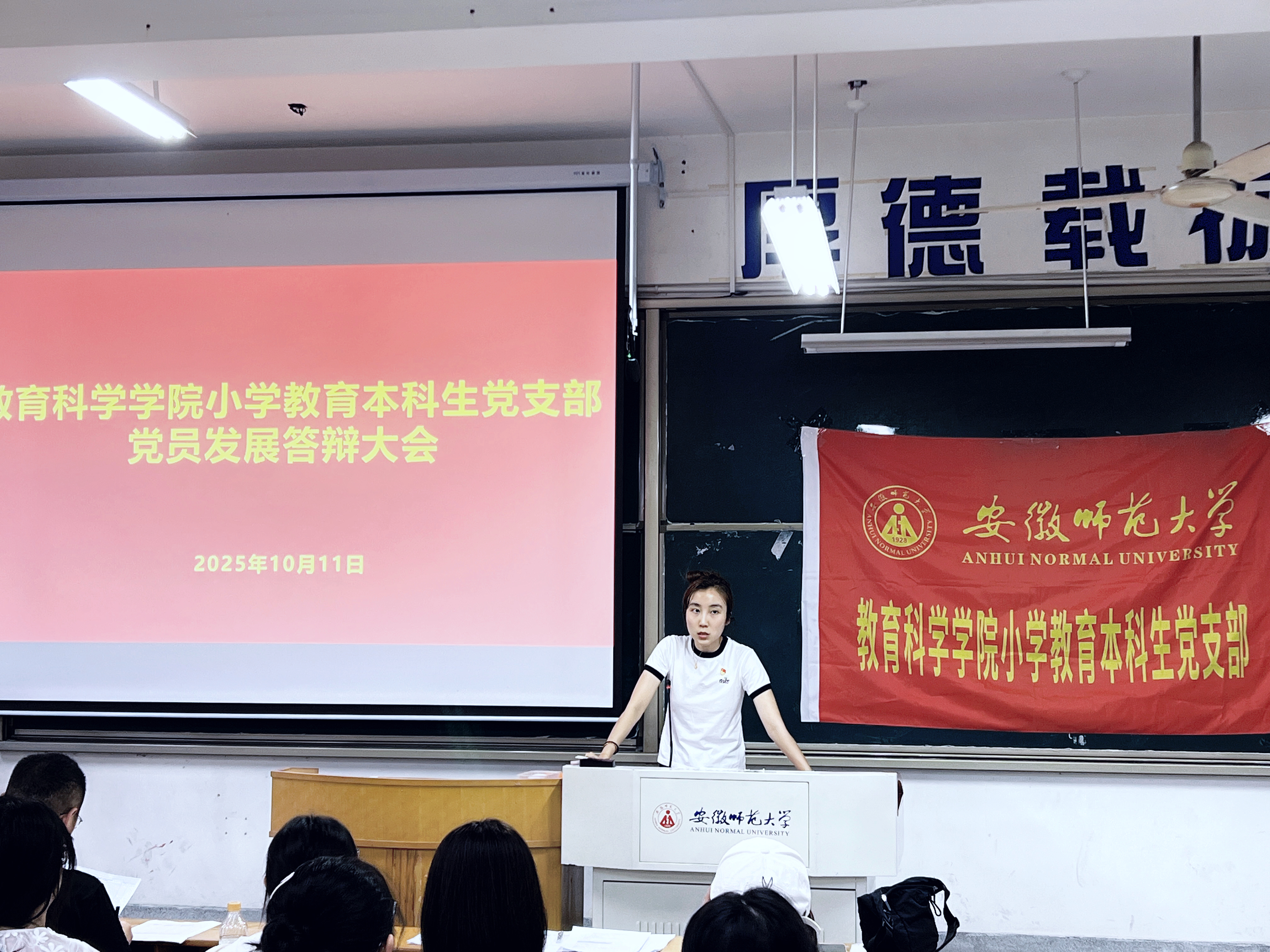 为进一步规范党员发展流程,加强对入党积极分子的培养与考察,切实提高党员发展质量。2025年10月11日下午,教育科学学院小学教育本科生党支部于田楼8202教室召开了2025年下半年党员发展答辩大会,党支部副书记莫大贡和支部全体学生党员、入党积极分子参与现场评议工作。会议由小学教育本科生党支部书记程雅楠主持。