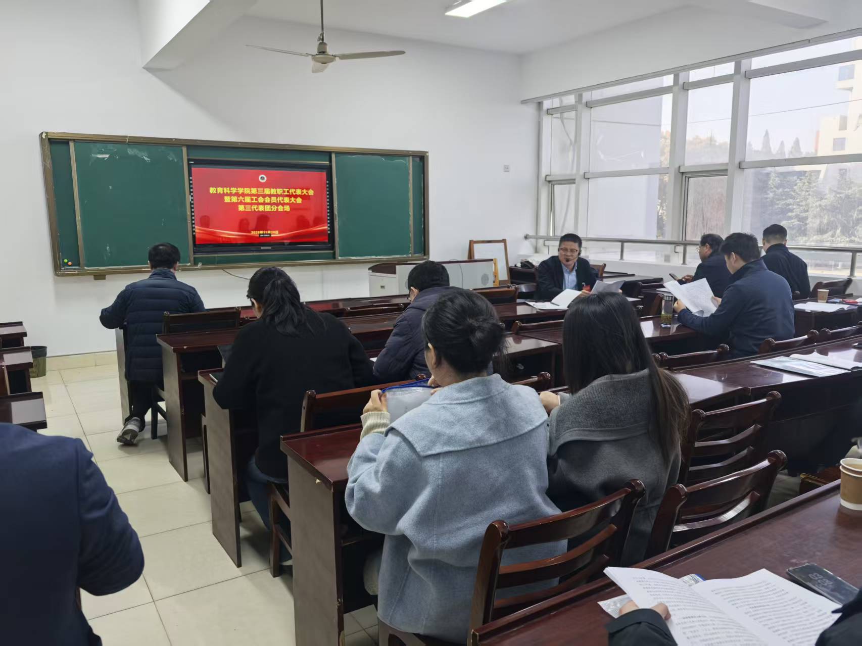 11月26日,教育科学学院第三届教职工代表大会暨第六届工会会员代表大会于学院一楼长三角教育一体化发展安徽研究院报告厅隆重召开,会议由院党委副书记、院长吴文涛主持,校教代会执委会副主任、机关党委书记汪俊武受邀出席,教育科学学院教职工代表、工会会员代表、特邀代表、列席代表等56人参加会议。